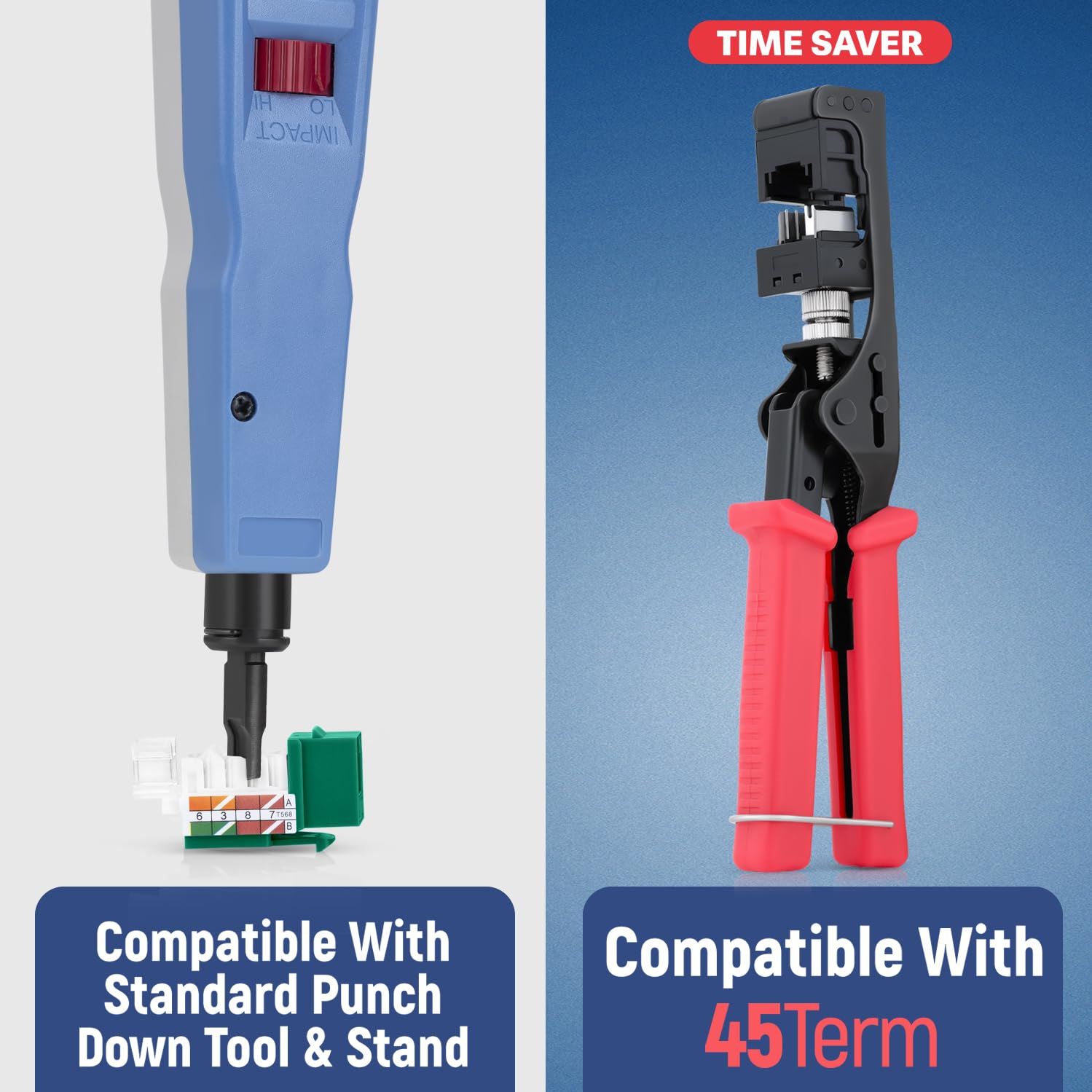 - Compatibility - compatible with our 45° Angled speed termination tool - 45Term (B0BL3GS7ZY). The jacks can also work in conjunction with a standard punch down tool and punch down stand for convenience.