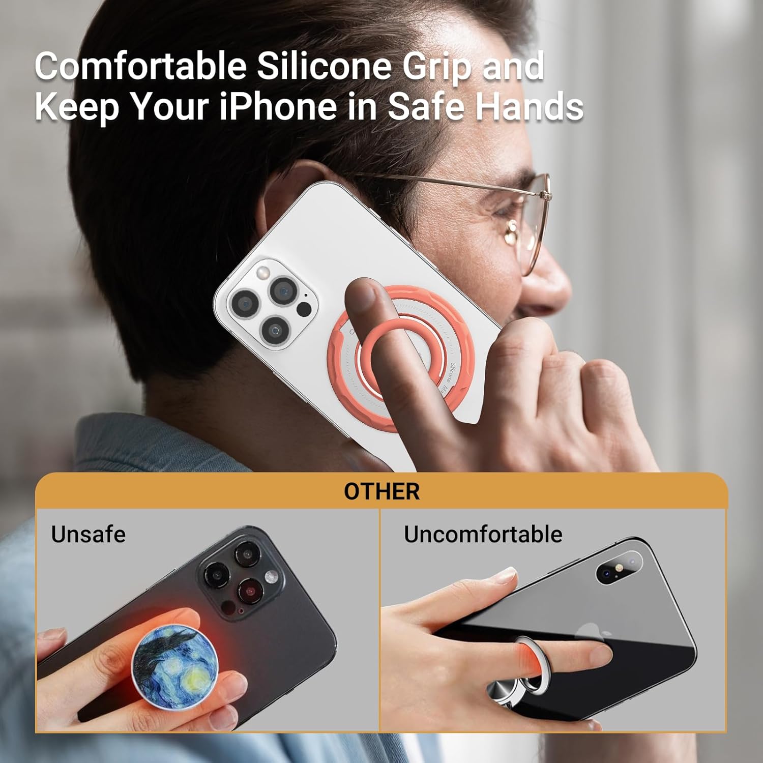- ❤️【Customer Support】Our magsafe finger grip features a high-quality silicone grip ring for a comfortable, secure hold, you can normally lift your phone without any issues. Please do not deliberately pull or stretch the grip ring, as this may damage its integrity and reduce its effectiveness over time. If you feel magnetic is not enough, you can use it with metal rings that have an ultra-strong adhesive. We offer fast and friendly customer service within 24 hours for any of your questions.