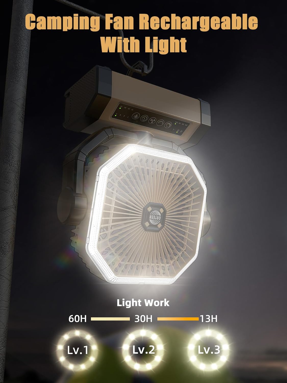 - PORTABLE CAMPING FAN WITH Light & Hook: This camping fan battery powered offers 60 LED beads, 3 dimmable brightness functions for different occasions. Great portable fan for bedroom, Office, Camping, RV, Power Outage, Rtc. The 2-in-1 portable outdoor fan has a 360° rotating hidden hook so you can hang the fan up and adjust the right angle. In addition, it is also suitable for use indoors as a large battery operated fan. This would be a great gift for your family and friends.