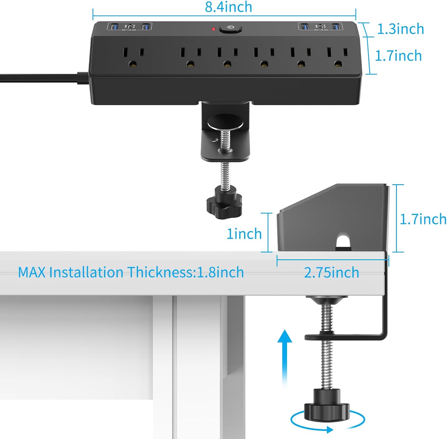 - 【Easy to intall】: Desktop power strip with USB ports is very easy to mount, you don't need to drill holes or purchase any additional tools, just fix the clamp to the table, and turn the button at the bottom to complete the installation for secure desk organization and tidy workspace.