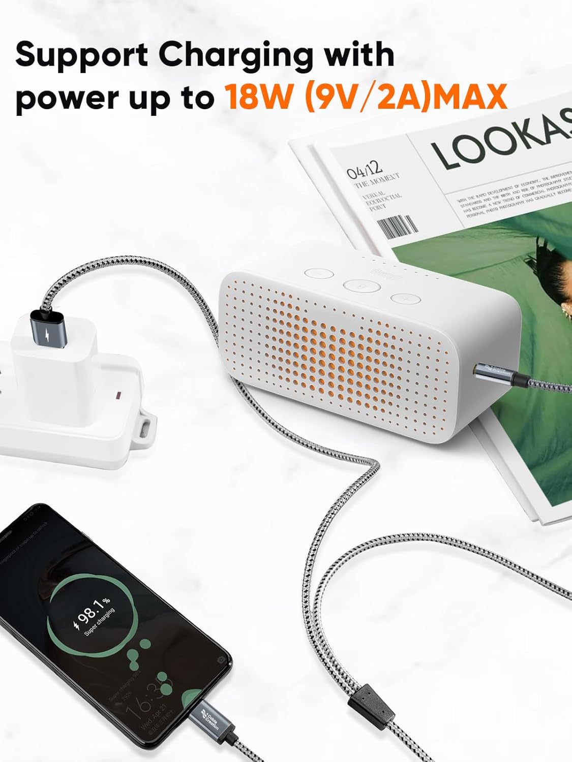 - 18W USB A to USB C Charge: This Aux cable supports PD 18W charge. The USB male port is compatible with All USB chargers and provides 18W Quick Charging for phones and tablets, No worry about power drains while playing music when you driving. Pls note: The maximum charging power supports 18W , not support charging high-power devices such as laptop.