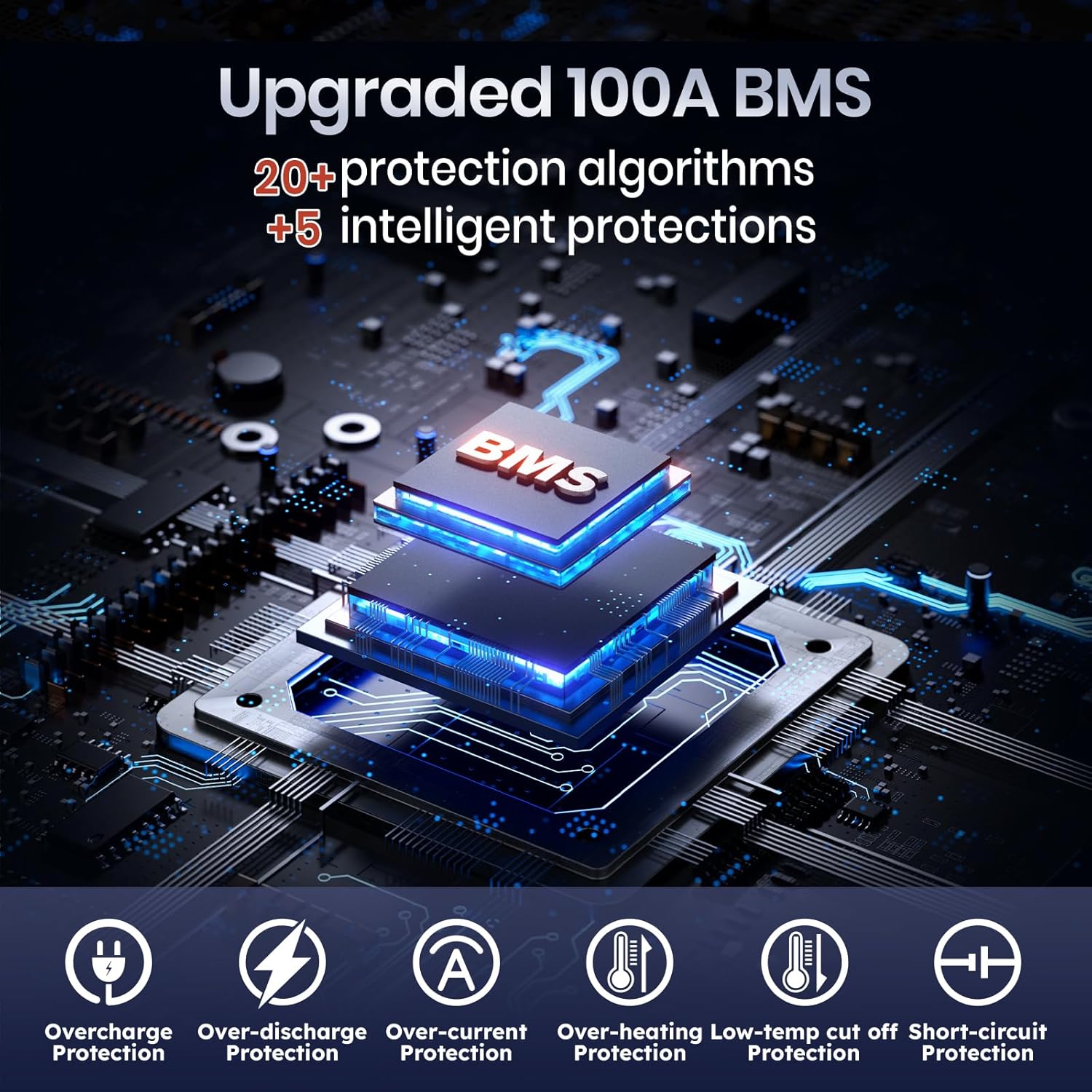 - 【100A BMS for All-Round Protection】Built-in 100A battery management system (BMS), Timeusb 12V 100Ah group24 LiFePO4 battery can provide over-charge, over-discharge, over-current, short-circuit & high-temperature protection to ensure safety.