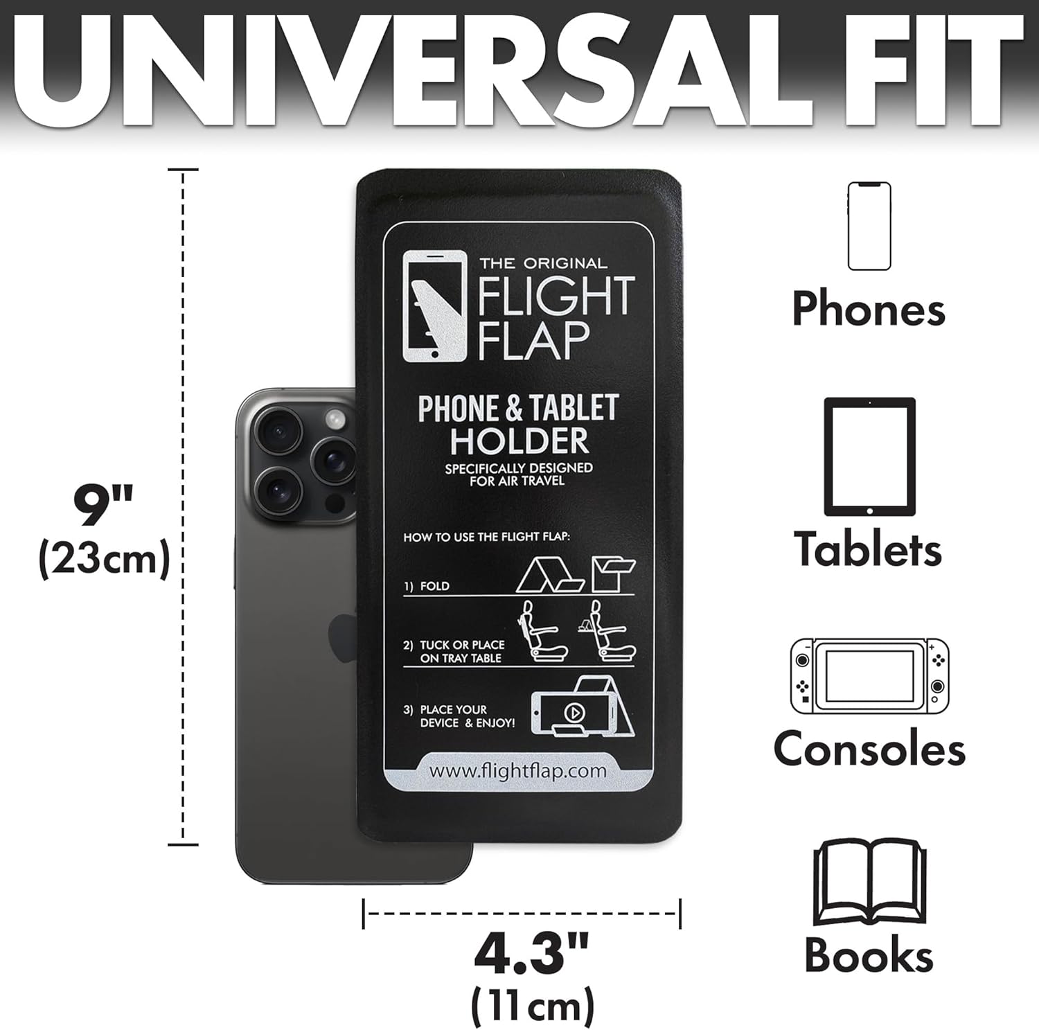 - FOR PHONES, TABLETS, BOOKS – The FLIGHT FLAP plane phone holder accommodates a wide range of phones (iPhone, Android), small tablets and e-readers (Kindle), handheld gaming consoles (Nintendo Switch) or your favorite books.