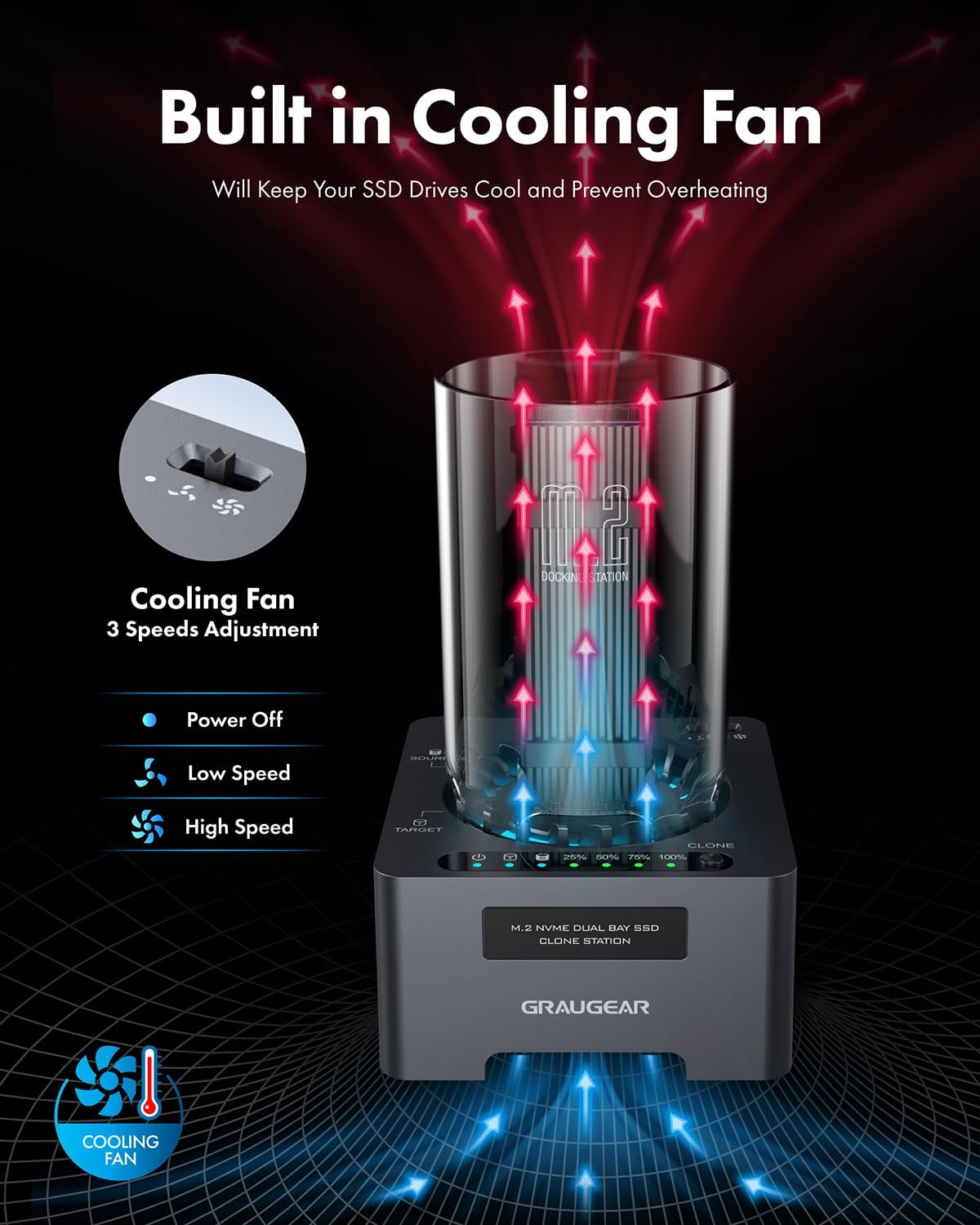 - 【Efficient Heat Dissipation】The combination of active heat disspation with built-in 3-speed cooling fan and passive heat disspation with aluminum heatsink helps dissipating the heat generated by M.2 SSD. Effectively protect your SSD from overheating and keep high transfer rate.