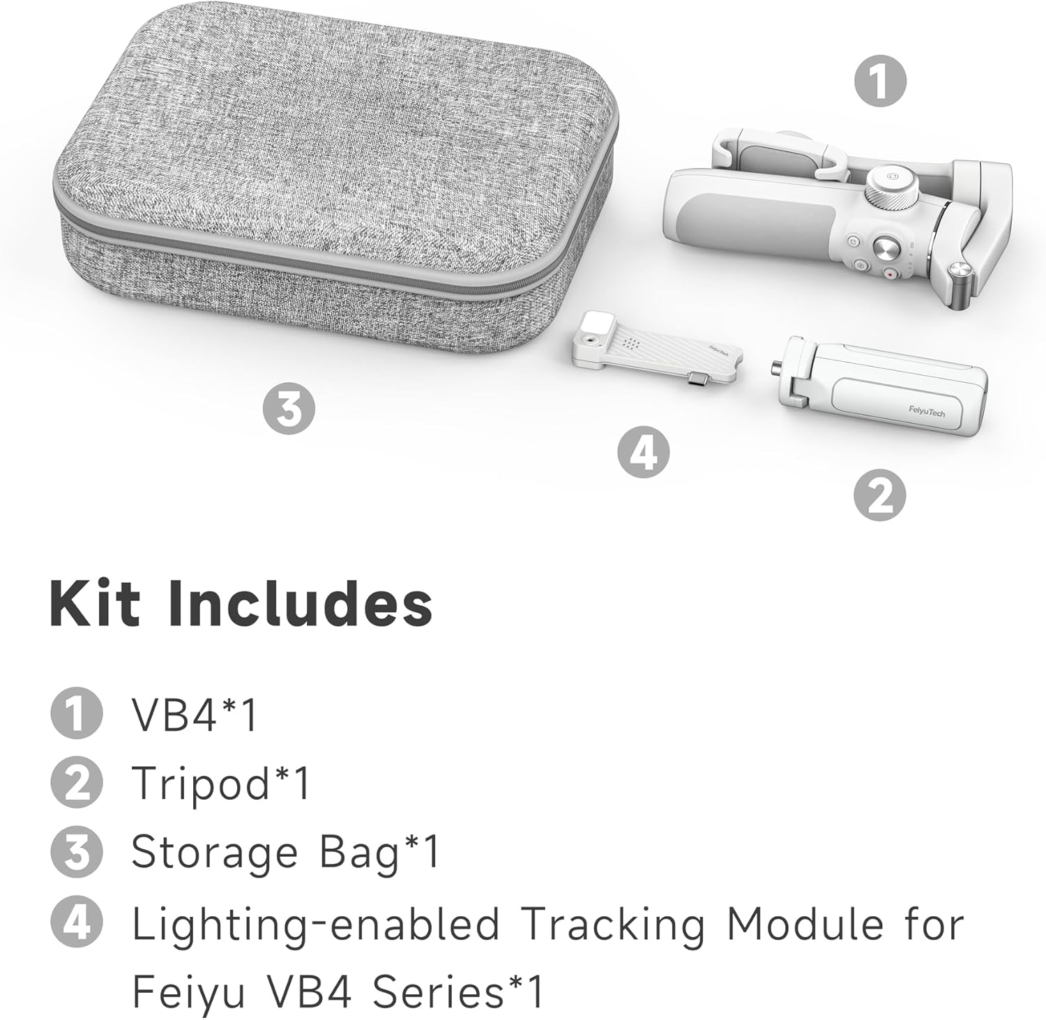 - Package content: VB 4*1, Lighting-enabled Tracking Module*1, Storage Bag*1, Tripod*1.