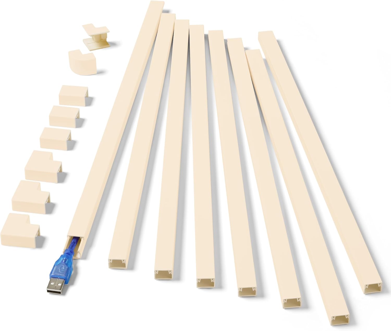 - Premium Quality Small Wire Covers for Cords: This cable management kit contains 8pcs 15.7in length cable raceways and 8 couplings (3 straight connections, 3 flat elbow, 1 inside elbow, and 1 outside elbow) that you can easily splice according to your wall cable management scheme
