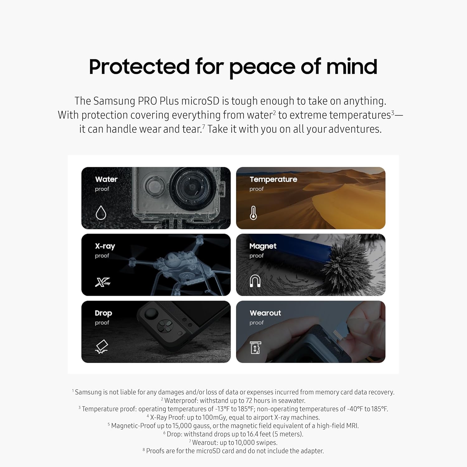 - PROTECTED FOR PEACE OF MIND: The Samsung PRO Plus microSD is tough enough to take on anything⁴; With protection covering everything from water⁵ to extreme temperatures⁶ — it can handle wear and tear⁷⁻¹¹