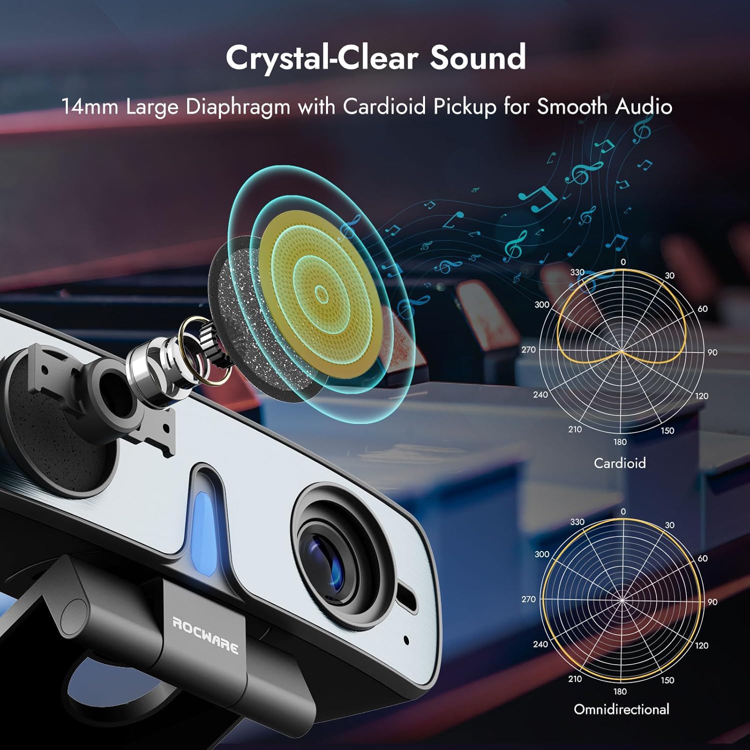 ROCWARE RC28 Webcam with Cardioid & Omnidirectional Microphone | HiFi Mode for Studio-Quality Audio, AI Noise Cancellation & Raw Audio Modes | 1080P 60FPS Web Cam for Streaming/Meetings/Beginners