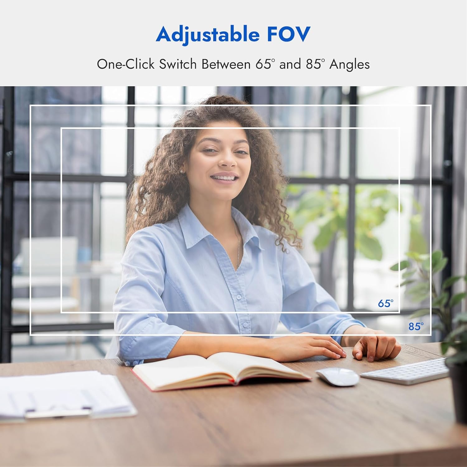 - 🔄 One-Touch FOV Control: 65° / 75° / 85°: Adjust your framing instantly with a long press—no software needed. Whether it’s a one-person call or a multi-participant meeting, choose from 65°, 75°, or 85° field of view for optimal composition. A must-have for computer camera users who want total control.