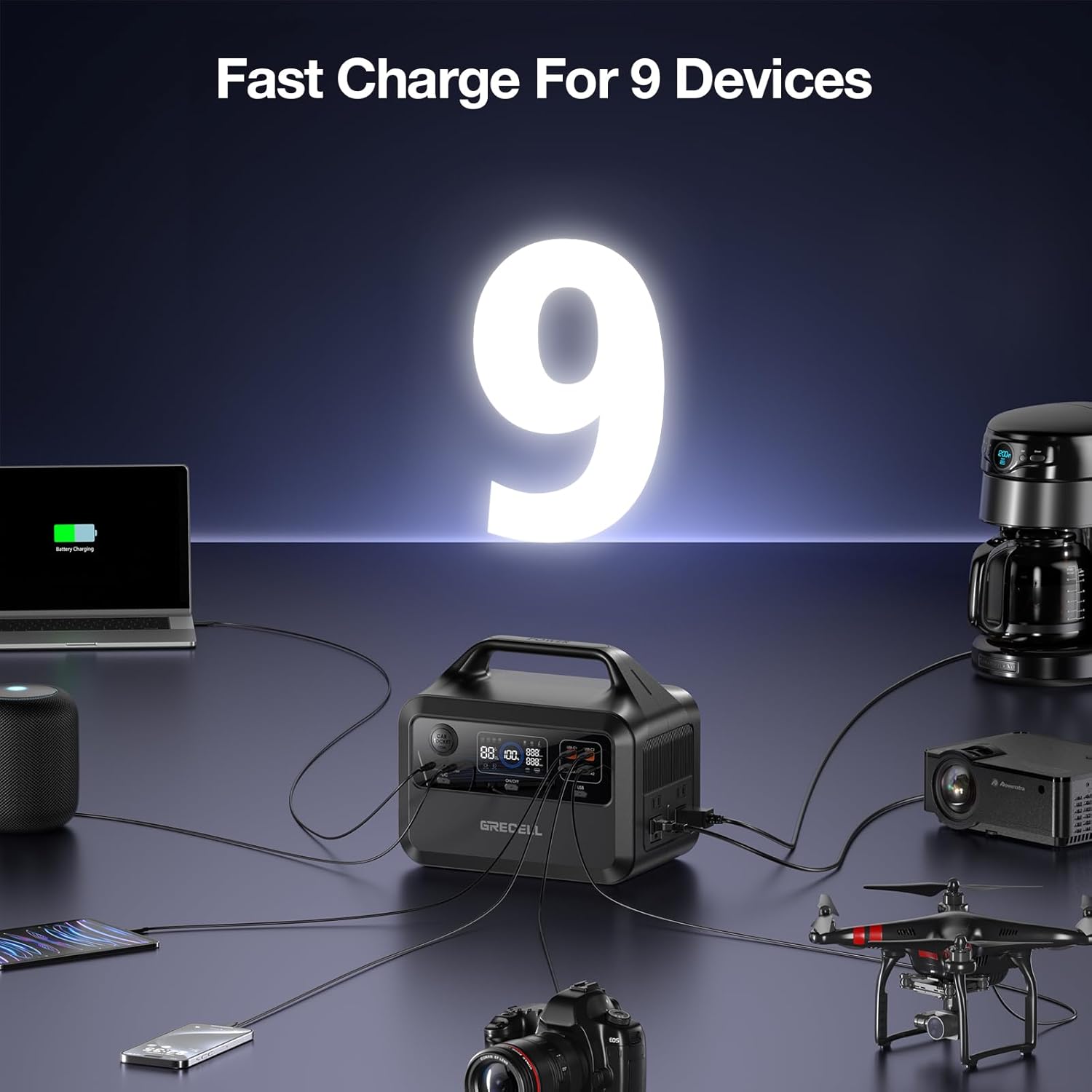 - 【High Capacity and Output】Experience true power on the go with the GRECELL PowerMax 600. With a massive 460Wh capacity, it can produce 600W AC output, with a peak of 1200W. This means you can charge heavy-duty equipment and power your essential devices wherever you are. Whether you're camping in the wilderness or facing a power outage at home, this portable generator will keep you connected and powered up.