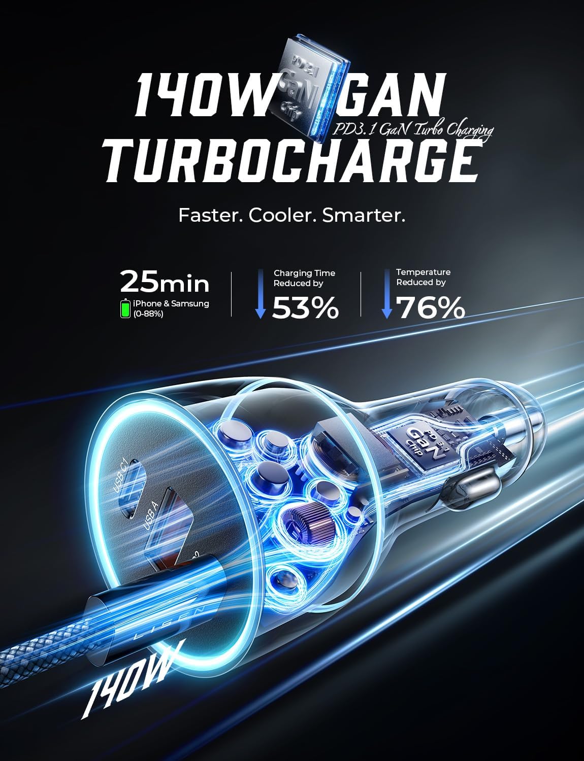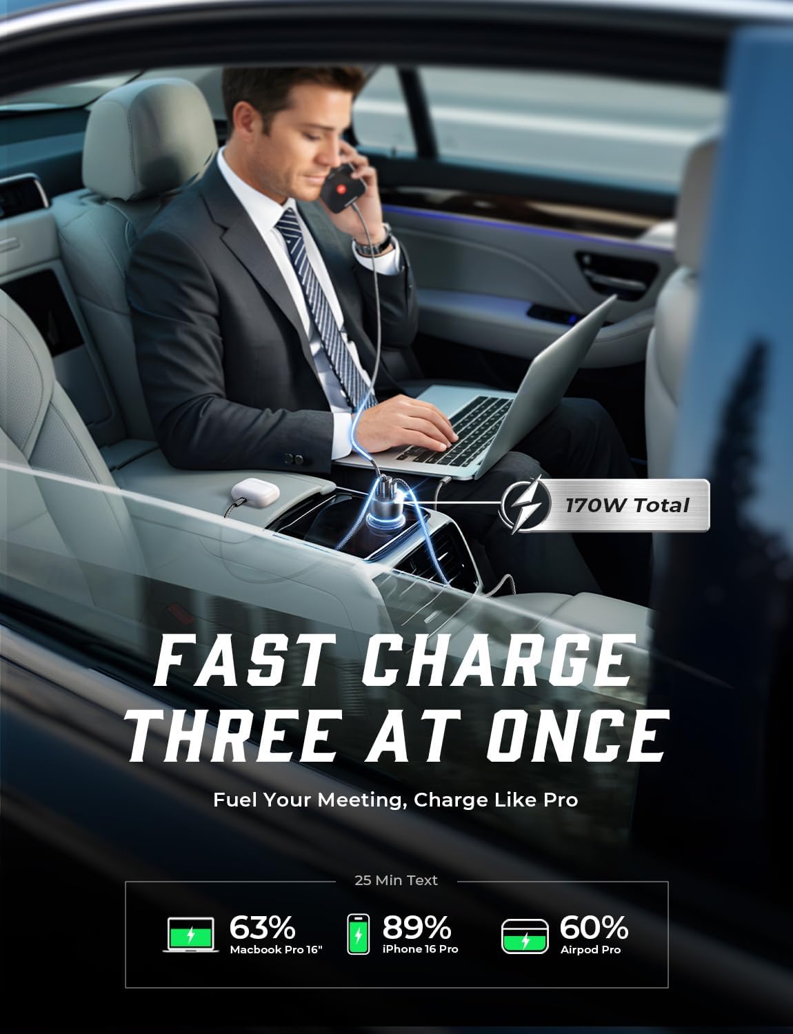 - 170W MUTIPLE FAST CHARGING: Experience the pinnacle of charging technology with the 170W fast charging USB C car charger. Equipped with USB-C2 + USB-C1 ports supporting PD 3.1 & QC 4.0 up to 140W and 30W, and a USB-A port offering QC30W, this fast car charger is fits PD3.1, QC4.0, PPS2.0, and QC3.0 fast charging protocols. Power up three devices simultaneously at once for your laptops, MacBook, iPad, drone, cellphone, iphone 16 pro max plus 15 , Samsung S25 Ultra, optimizing your time on the road with a total output of 170W.