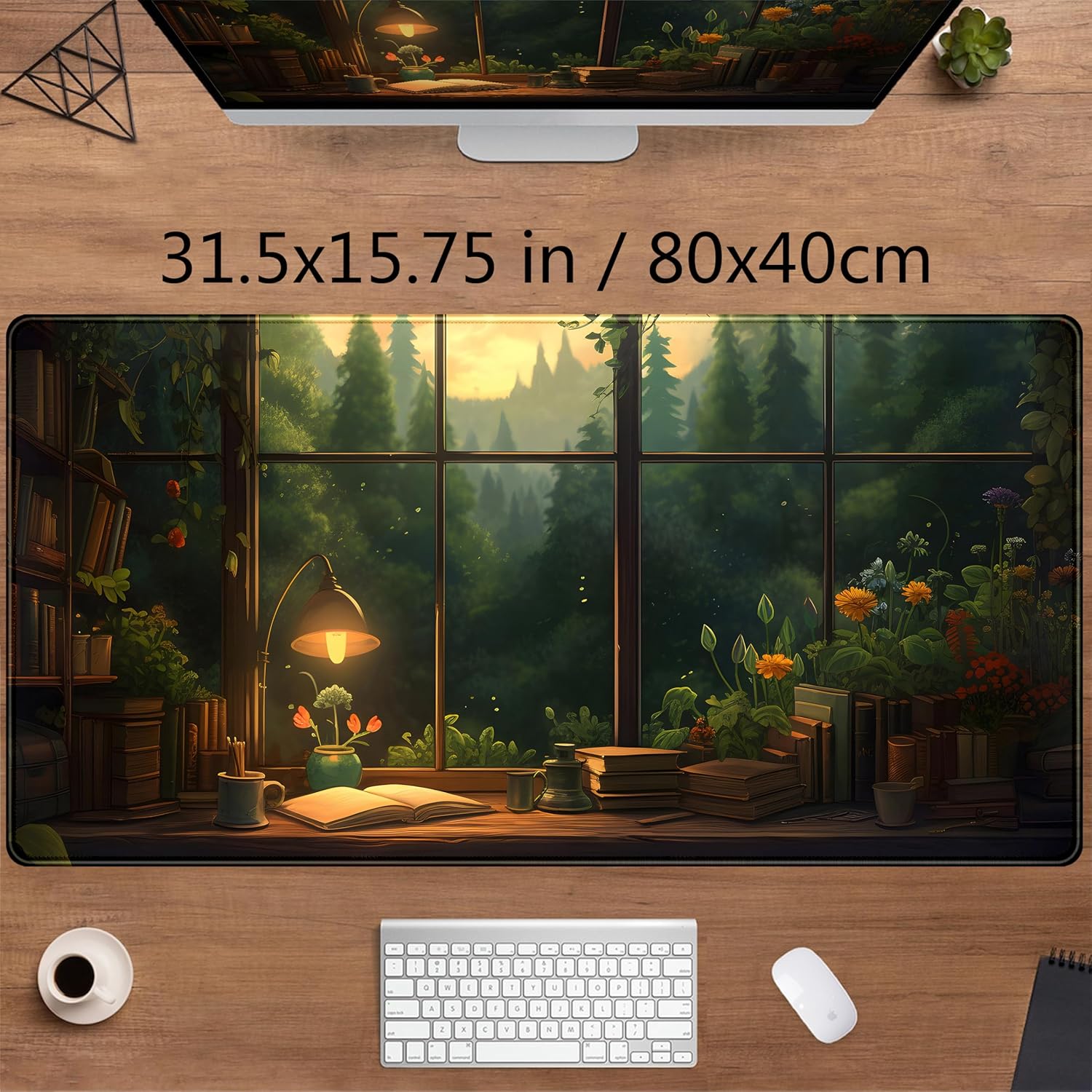 Anime Dark Green Plants Desk Mat Cute XXL Large Extended Mouse Pad Gaming, Lofi Aesthetic Computer Laptop Keyboard and Mouse Mat, Desk Accessories for Women Office Decor Mousepad, 31.5x15.75 in