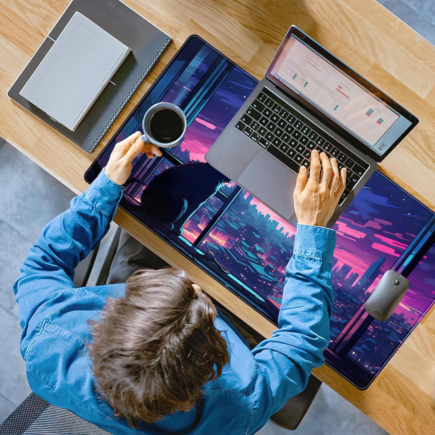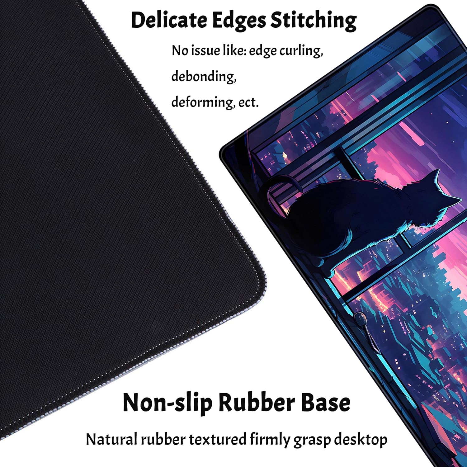 Cool Purple Kawaii Anime Moom Cat Desk Mat XXL Large Gaming Mouse Pad, Cute City Cats Desk Pad for Gamer Girl Women Office Desk Decor Mousepad, Computer Laptop Keyboard and Mouse Mat 31.5x15.75 in