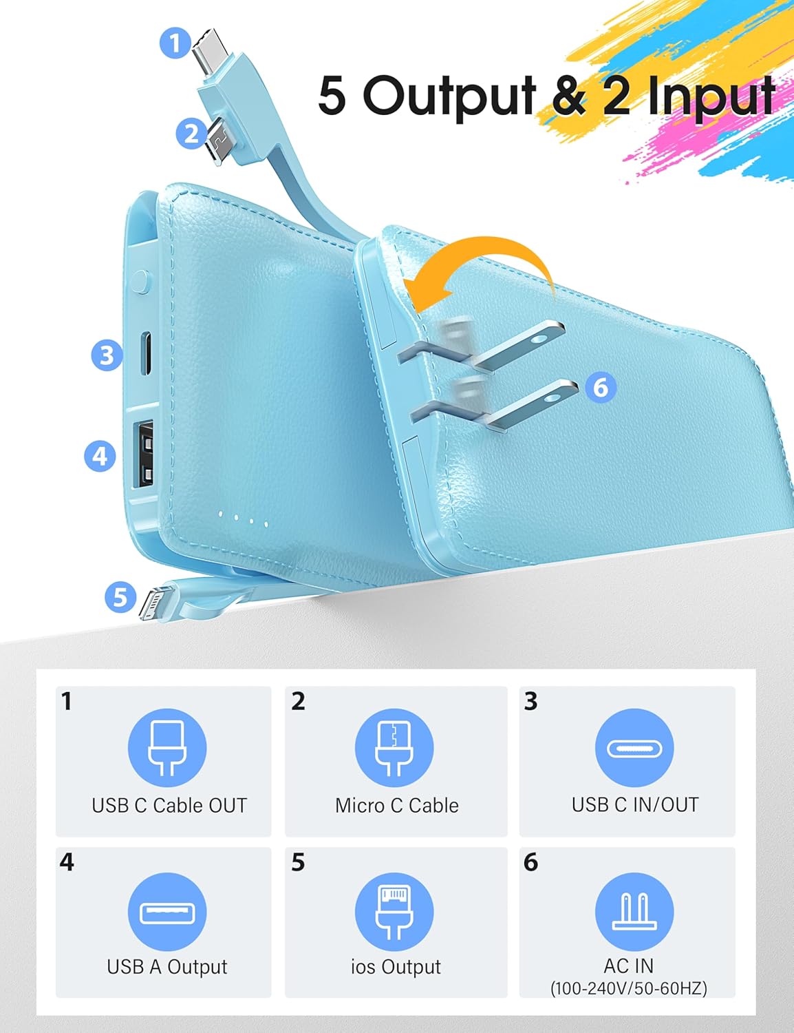 - Portable Charger Built-in AC Wall Plug and Cables:This all-in-one power bank embedded with AC wall plug and charging cords connects the battery pack to the phone and outlet together.It is allow able to recharge itself directly from the wall socket and power your phone with the built-in cord No additional cables are required