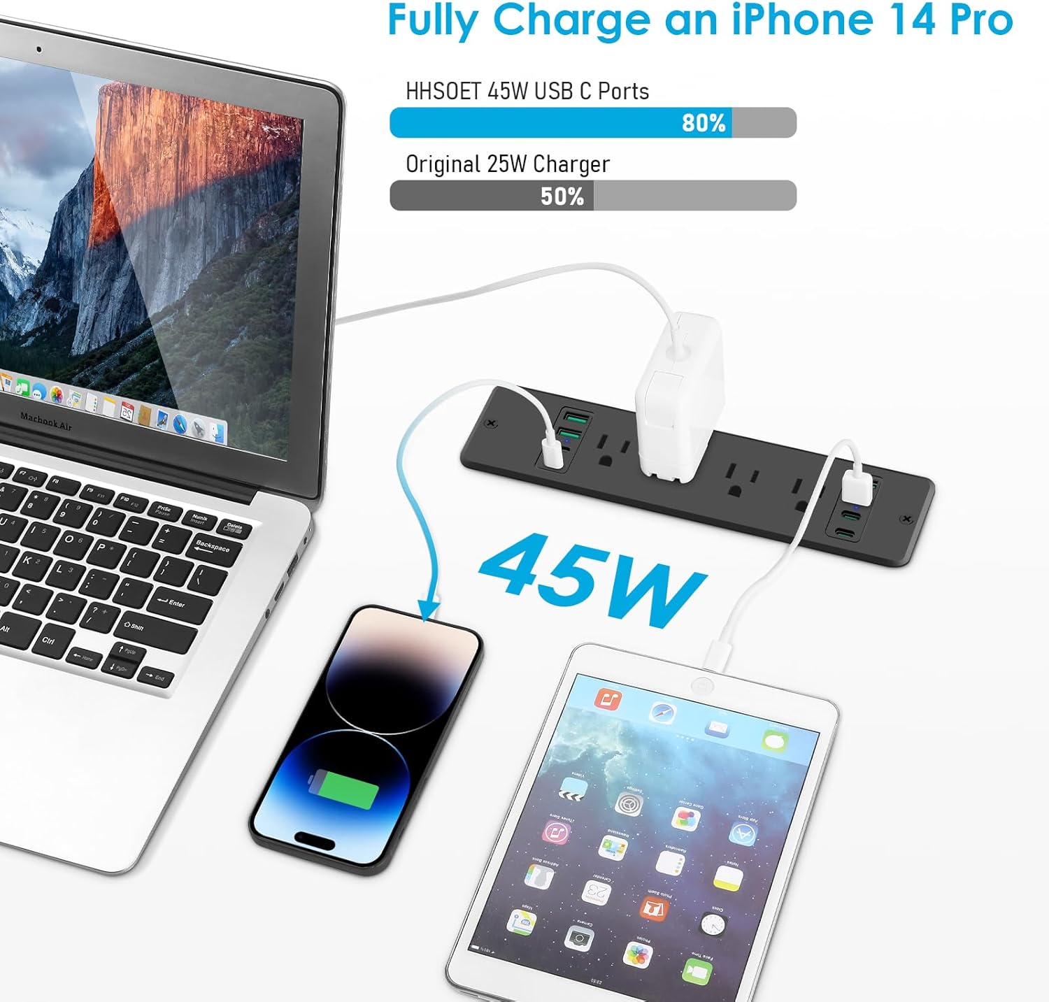 - 45W Fast Charging Power Strip: 8 Outlets Output rating 10 Amp / 125 Volt / 1250W. Come with fast charging QC 3.0 36W Max USB-A port and PD 3.0 45W Max USB-C port. different phones, iPads, laptops, and many many other things and this has every single plug in one strip, USB, usb c, and standard plug. So there is good future-proofing.