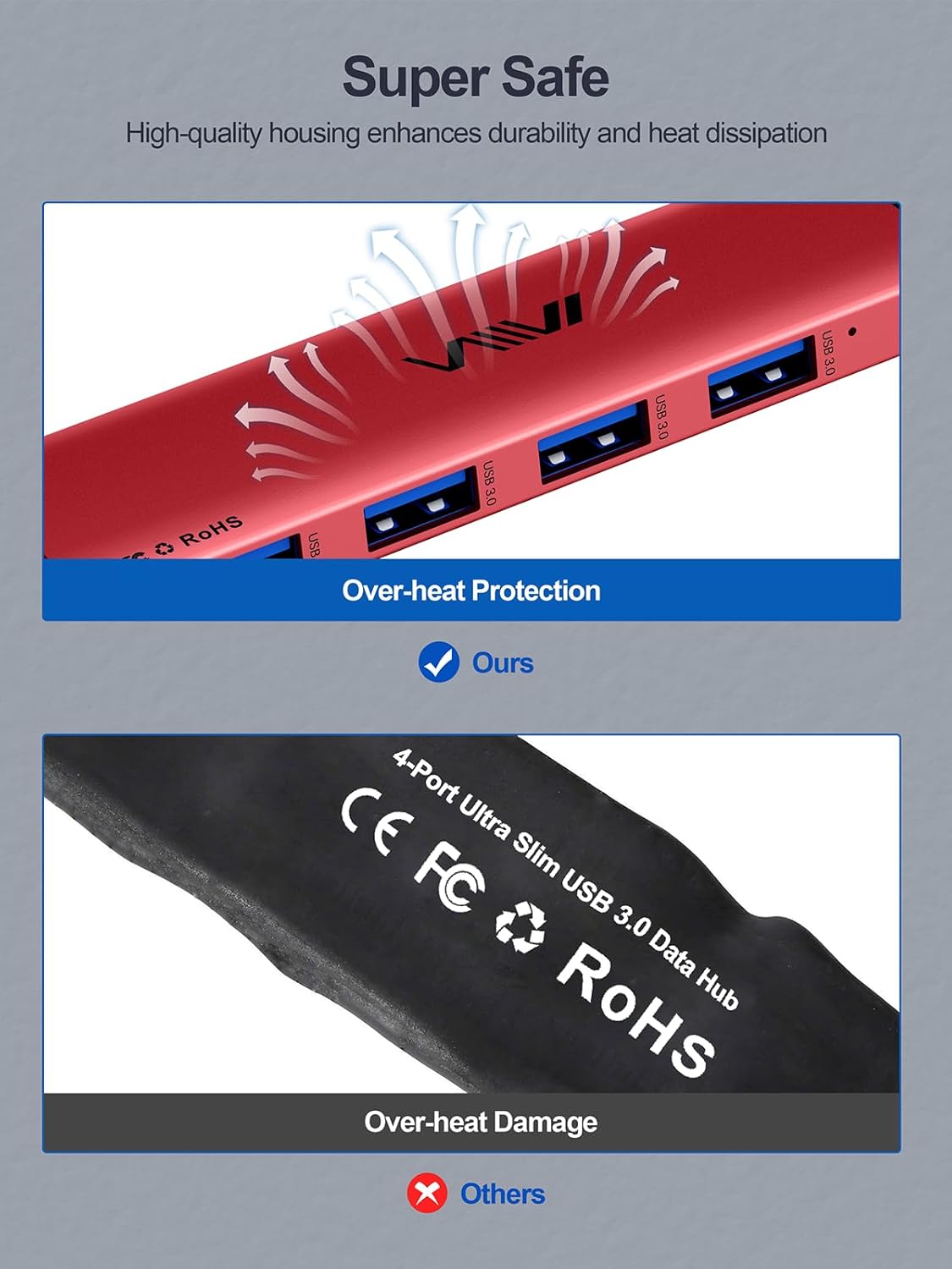 USB 3.0 Hub,4 Port USB Splitter Extender Portable Adapter Multiport Data Hub for Laptop,Xbox, Flash Drive,HDD,Console,Camera,Keyborad,Mouse Windows,Mac OS PC,Not Designed to Charge Devices-Red
