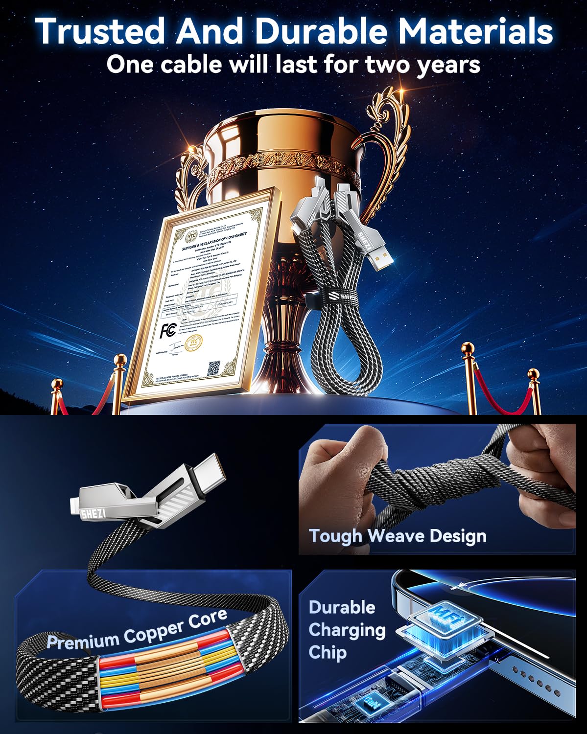 - 240W Fast Charging & 480mbp/s Data Transfer: 4-in-1 USB cable offers high-speed and safe charging up to 240W, enabling faster charging compared to standard cables. It can charge a Samsung S24 Ultra phone to 80% in 30 minutes (actual speed depends on your device and charger). The cable supports data transfer at 40-60MB/s, allowing a 1GB file transfer in 20 seconds. Compatible with iPhone, Samsung, tablets, Air, Mini, Pro, MacBook, and more, this cable saves time and enhances efficiency