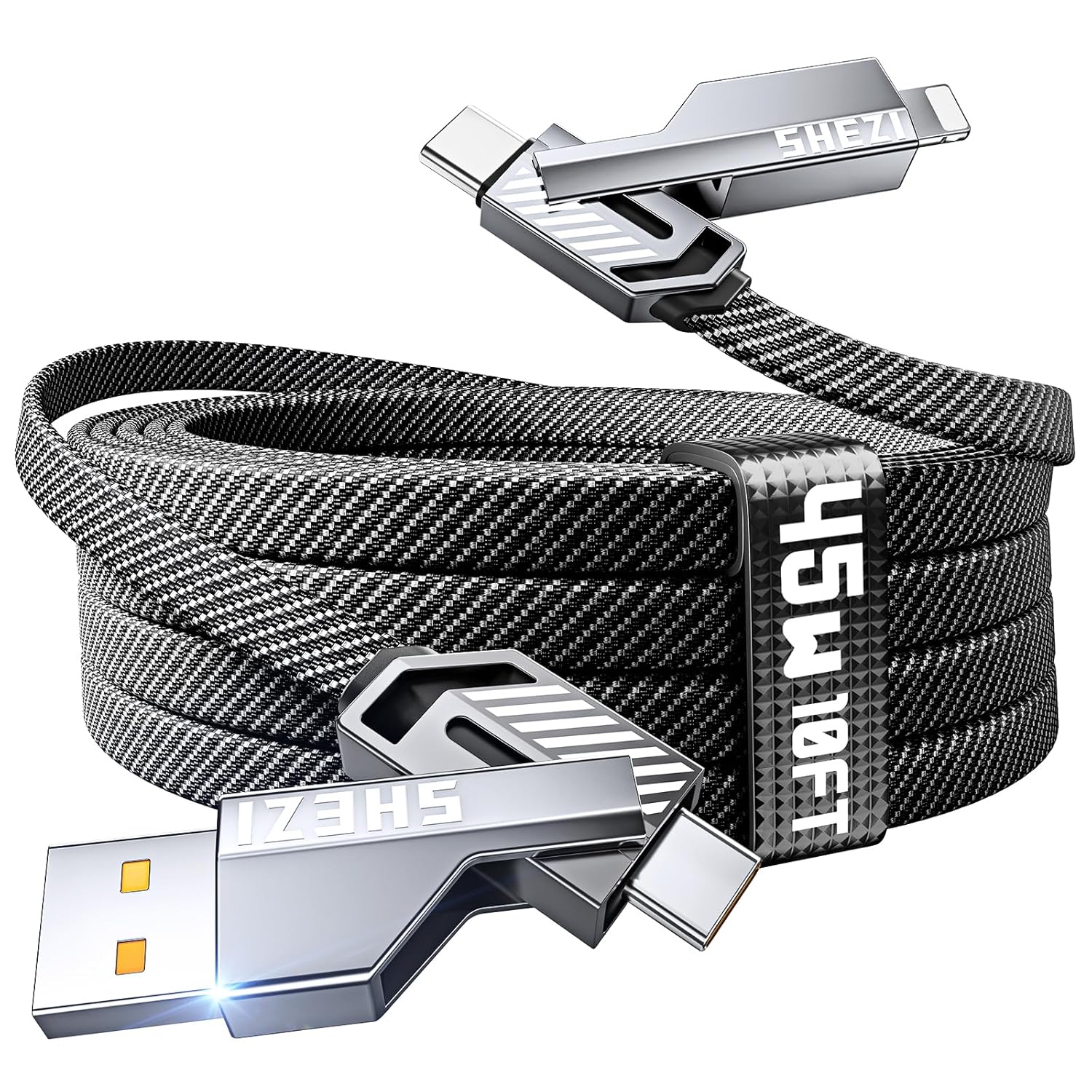 - Easy to store and carry: The 10FT length is perfect for use at home, in the office, in the car, or while traveling. The 4-in-1 USB charging cable is easy to fold and store in your handbag, laptop bag, pocket, and more. Reduce clutter and save space