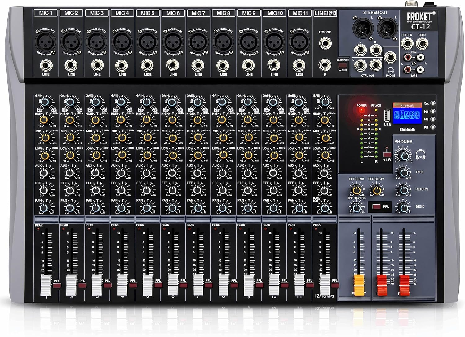 Pro DJ Mixer 12-Channel Audio Console - Bluetooth/USB Streaming, 48V Phantom Power, 3-Band EQ for Live Stage, Recording Studio & Karaoke Systems (CT-12)