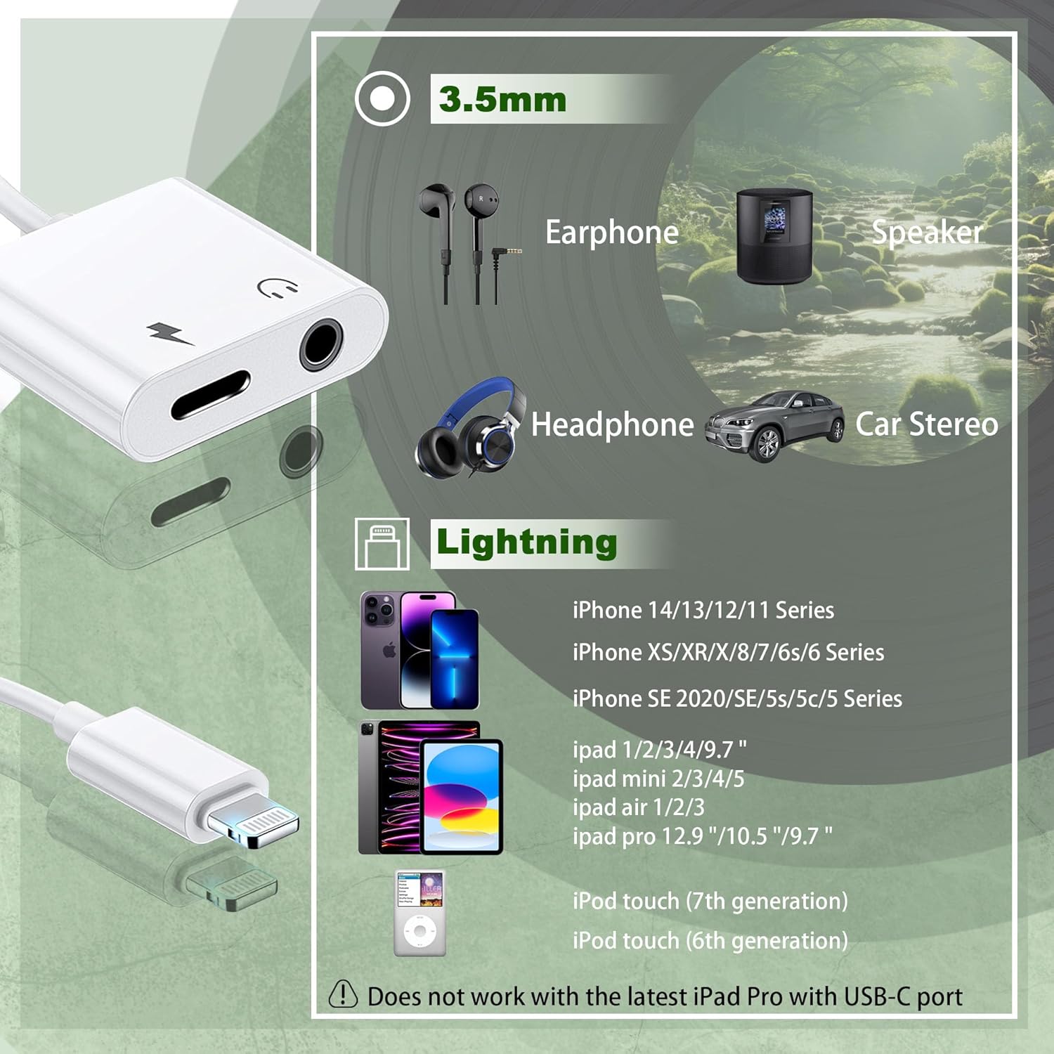 - WIDELY USED: The apple lightning to 3.5 mm headphone jack adapter is suitable for iPhone 14/13/12/11/XS/XR/8/7, headphone jack to lightning adapter supports all iOS system versions, ensuring wide device compatibility