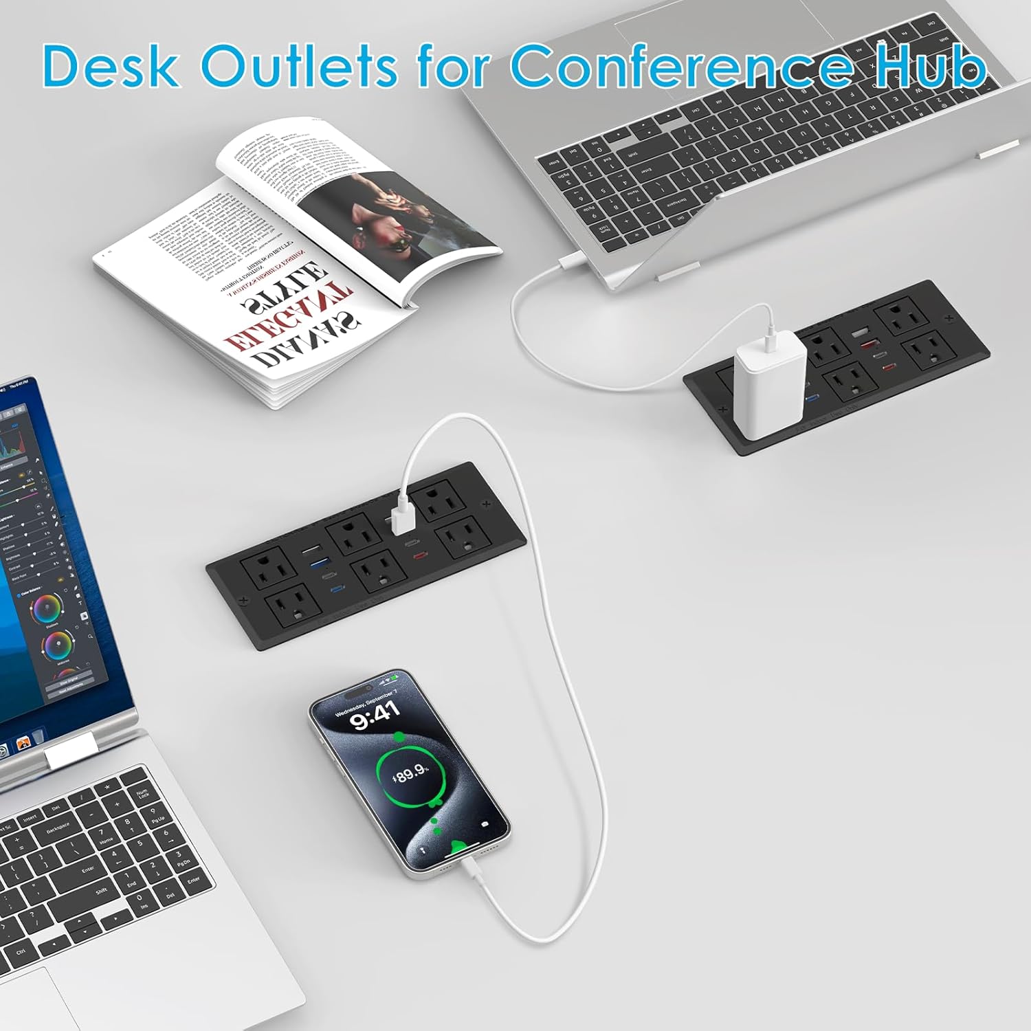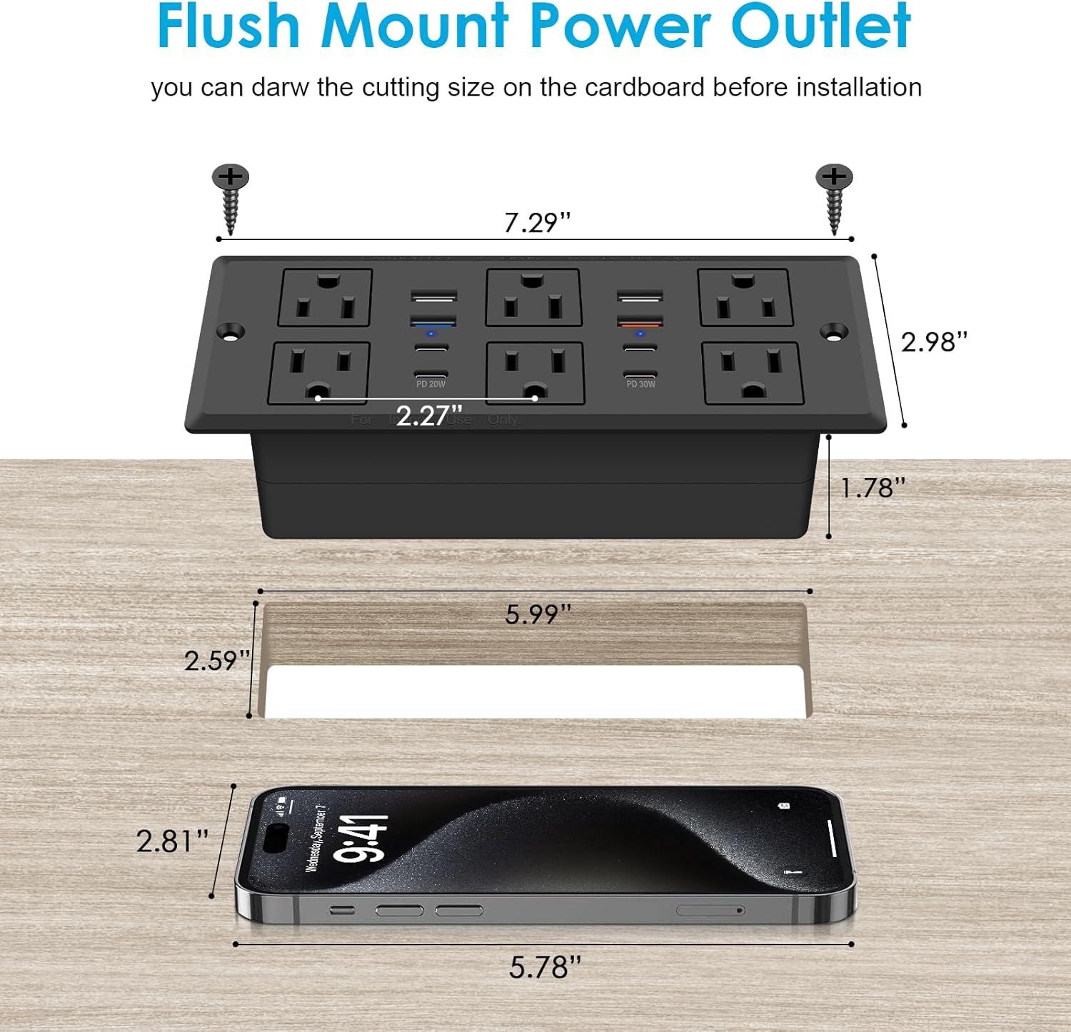 - Built in Conference Recessed USB Strip: Make a L 6 * W 2.6 inch hole.Classic style designed specifically for desktop, hide the socket. Reserved a widely spaced outlet to plug desk electronic accessories large plugs.