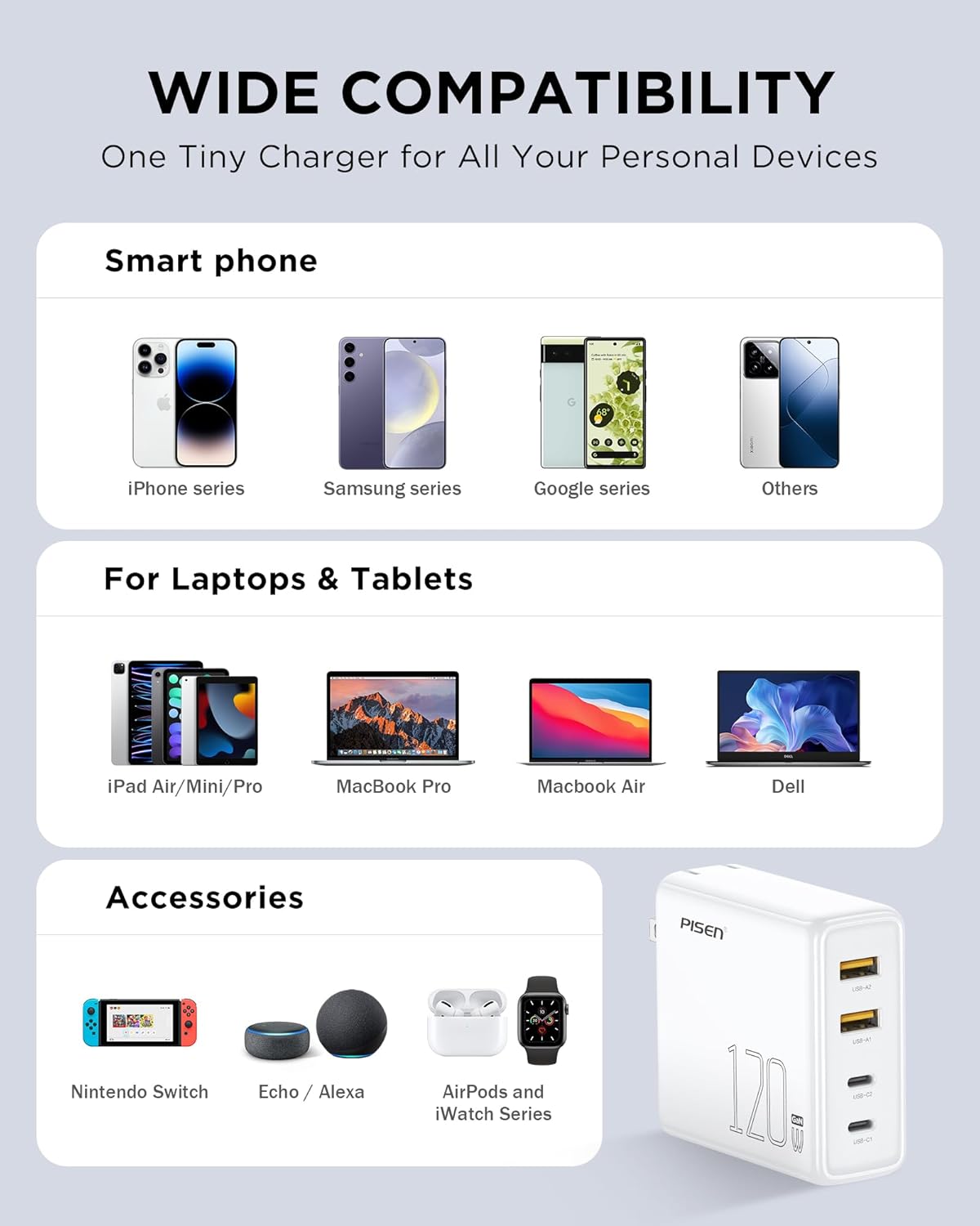 - [Wide Compatibility]: PISEN 120W USB-C charger block with GaN, PPS & PD 3.0 technologies is compatible for MacBook Pro/Air, iPhone 16/15/14/13/12 series and previous models, iPad Pro/Air, Galaxy S10 or previous models, Google Pixel, Dell XPS, Switch, and more.