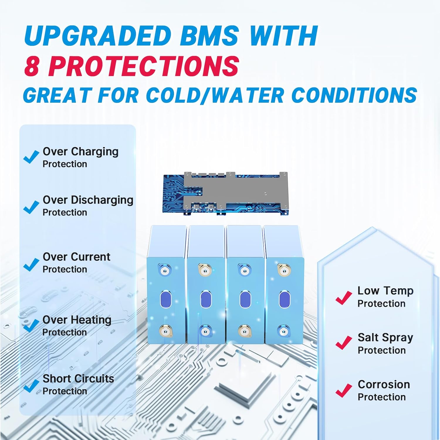 - 【Upgraded BMS with 8 Protections-Great for Cold Conditions】Redodo 12V 280Ah low temp cutoff lithium battery is with our custom 200A BMS which has 7 protections, expect for 100% full protection against overcharging, over-discharging, over-current, overheating, and short circuits, it adds 3 NEW protections against dust, water, and salt spray. Comprehensive protections ensuring its optimal performance even in extreme cold conditions, such as winter outing, mountain UPS power, fishing finder, etc.