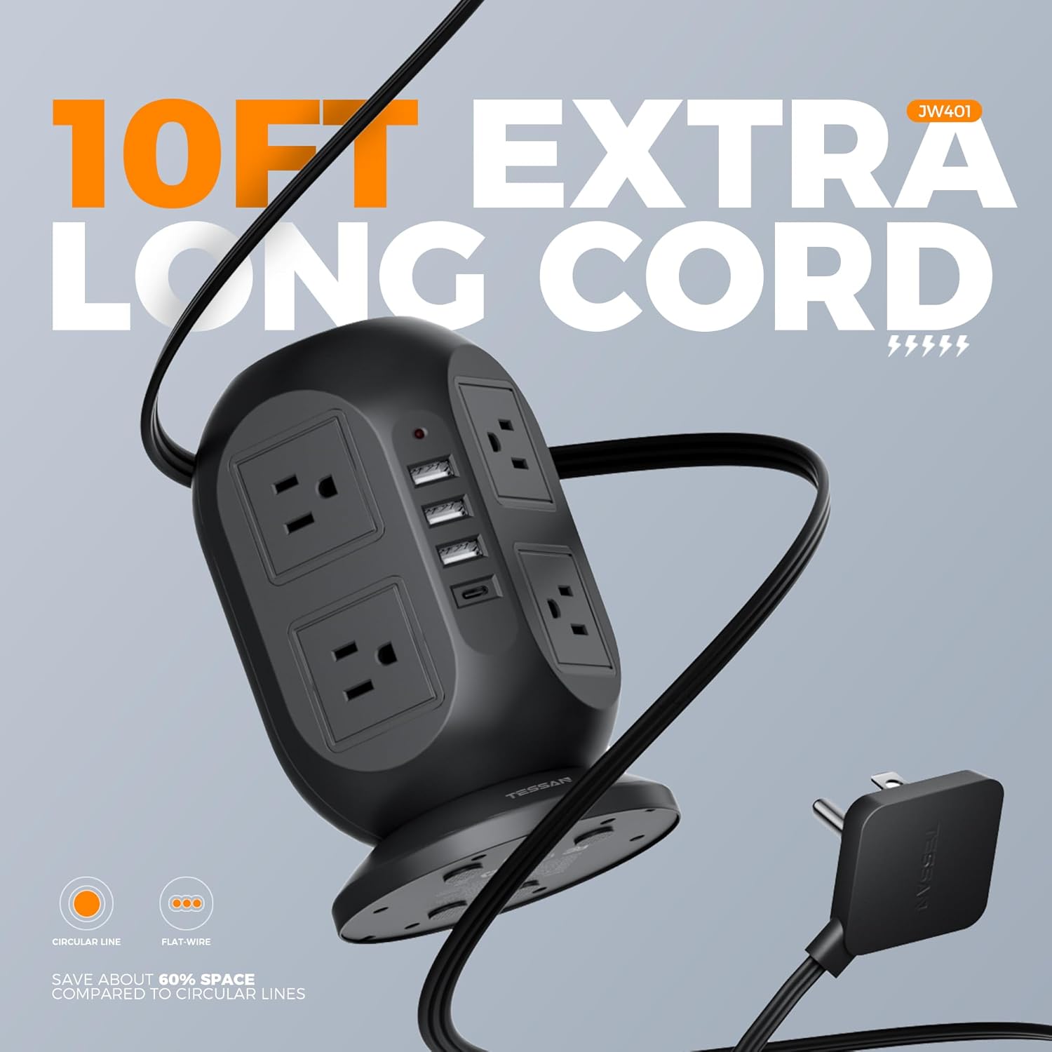 Surge Protector Power Strip Tower, TESSAN 10 ft Flat Extension Cord with Multiple Outlets, 8 AC Outlets 4 USB Ports (1 USB C), Charging Station with Surge Protection for Home Office Dorm, Black