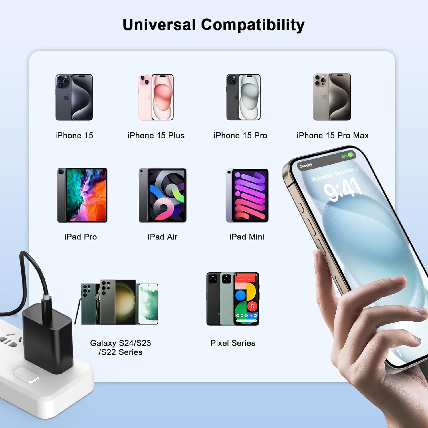 - 【Universal USB C iPhone 16 15 Charger】 Use this 20W USB C wall charger with 10FT Long iPhone 15 fast charger cord to access the fast charging for iPhone 16/16 Plus/16 Pro/16 Pro Max/15/15 Plus/15 Pro/15 Pro Max, New 2021 iPad Mini 6th Generation, 2021/2020/2018 iPad Pro 12.9 in 5th/4th/3rd Generation, iPad Pro 11 in 3rd/2nd/1st Generation(2021/2020/2018), iPad Air 4th generation (2020).