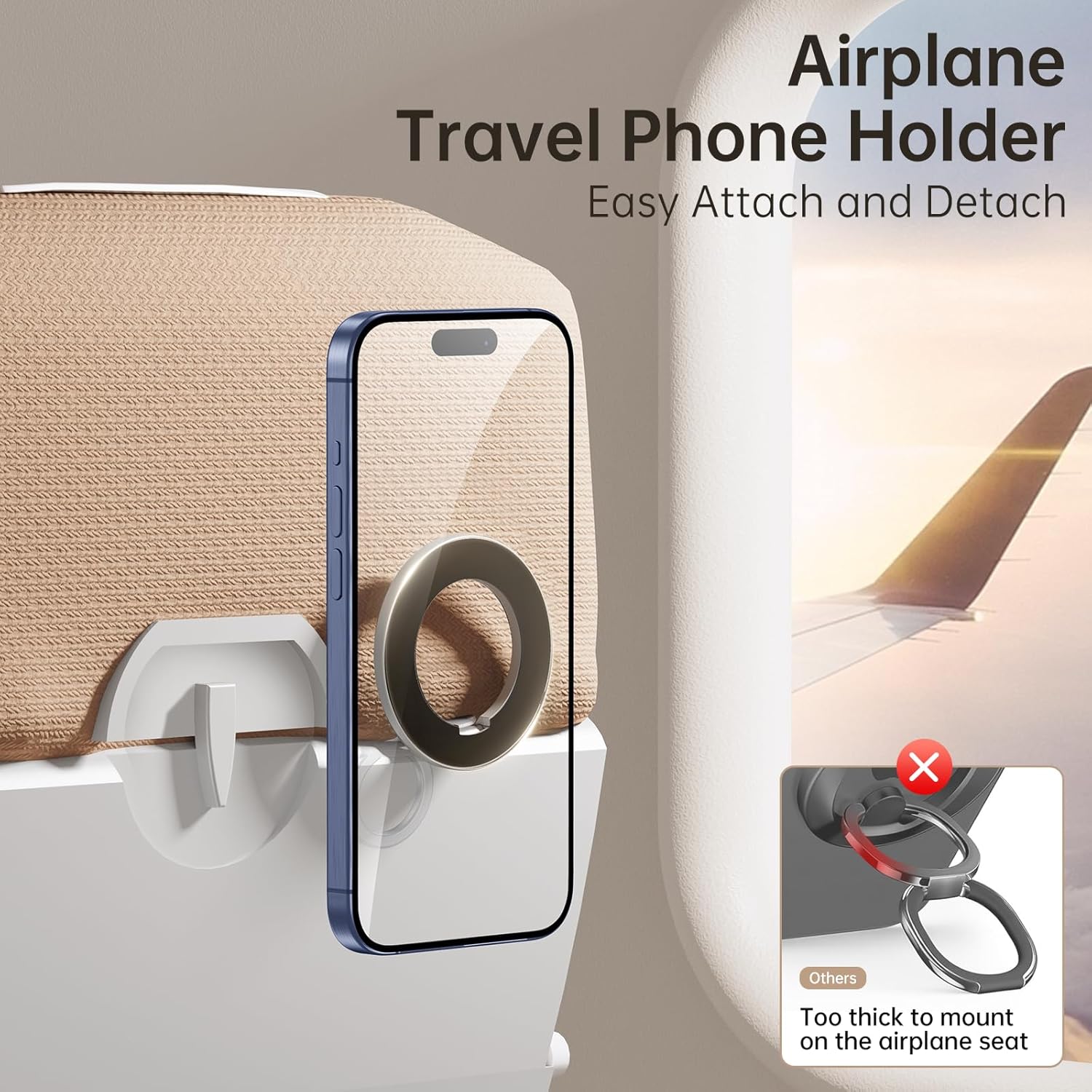 - [Airplane Magsafe Ring Holder] Magnetic phone ring Stand clamps on tray table, helping free your hands on the planes and high-speed trains, allowing you to enjoy your journey. You can open the double-loop during the flight and attach it to various seat backs to watch movies. The MagSafe magnetic attraction makes it easy to rotate and remove your phone, making it simple and convenient to use.