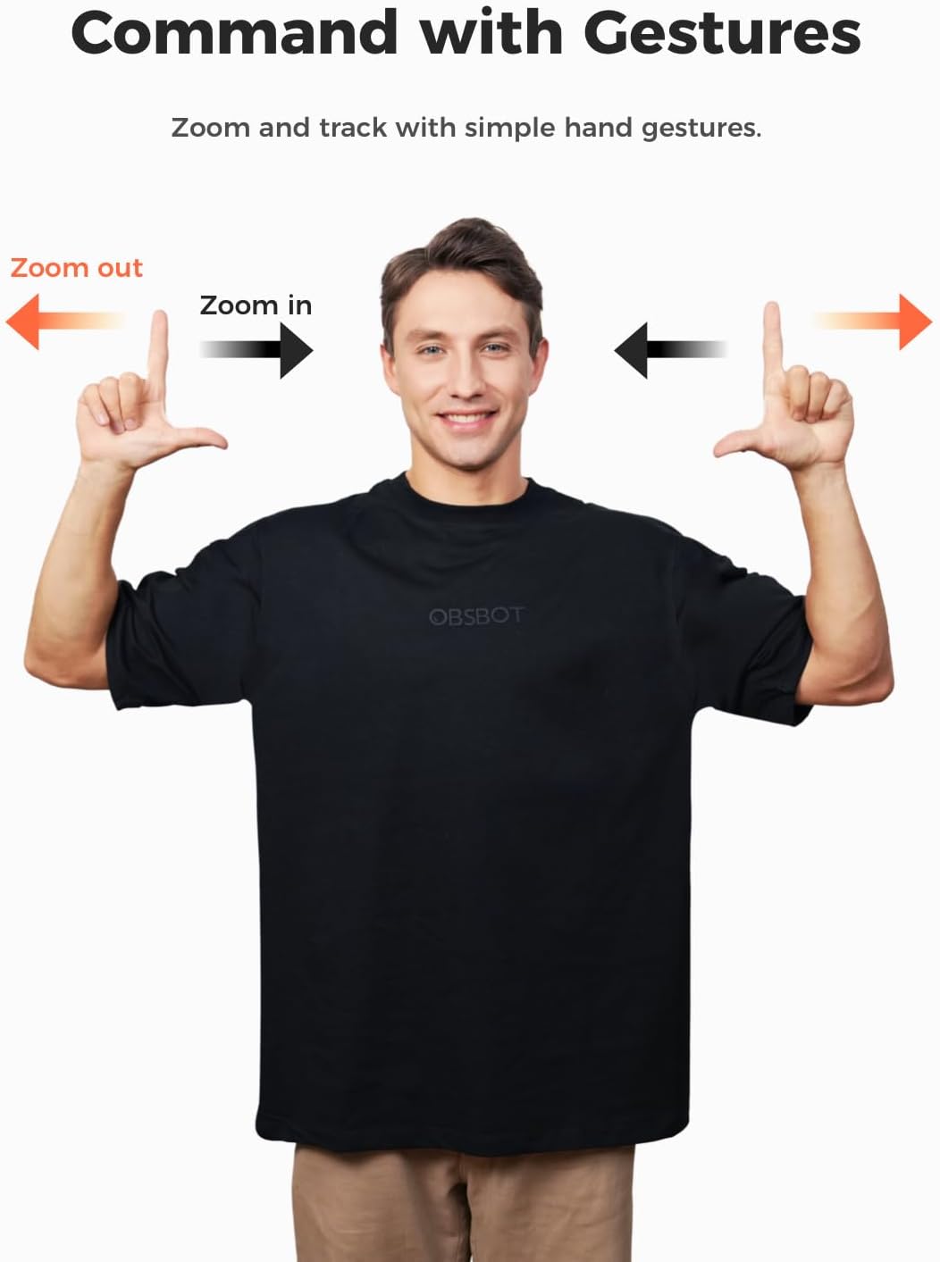 - 【Dynamic Gesture Control】 Along with the 2.0 dynamic gesture control, our streaming camera says goodbye to cumbersome manual operation. Simply face the web cam, make an “🖐” gesture to lock the portrait tracking target, and make an “👆” gesture to control the zoom easily.