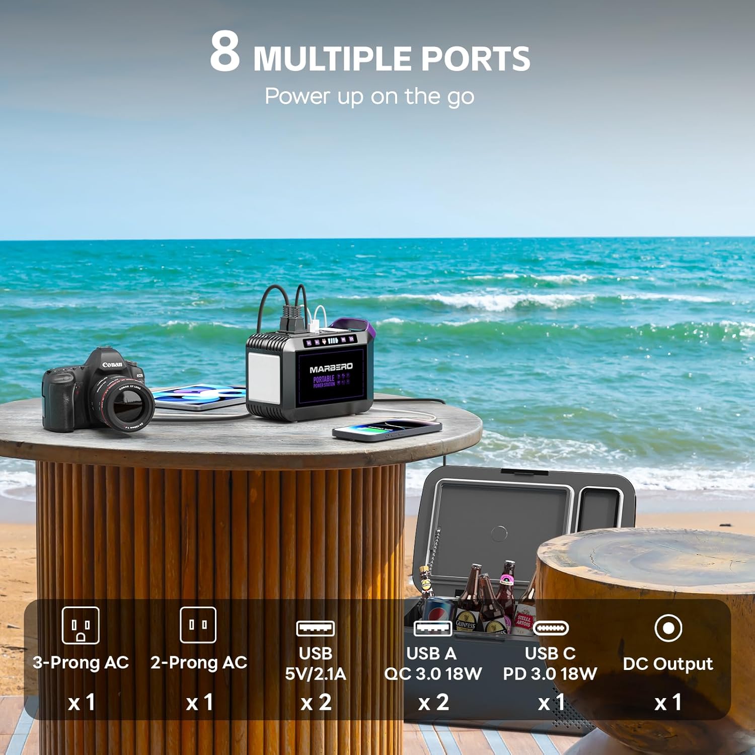 - SOLAR GENERATOR WITH SOLAR PANEL: Looking for a reliable power solution for your outdoor adventures? Look no further than the MARBERO Solar Generator M822MAX paired with the MARBERO 40W Solar Panel. Whether you're camping in the wilderness or embarking on a road trip, this powerful duo ensures you have access to electricity wherever you go. With its large capacity, this portable power kit is perfect for overnight stays or extended periods off the grid. Say goodbye to worrying about charging your devices and hello to uninterrupted outdoor fun!
