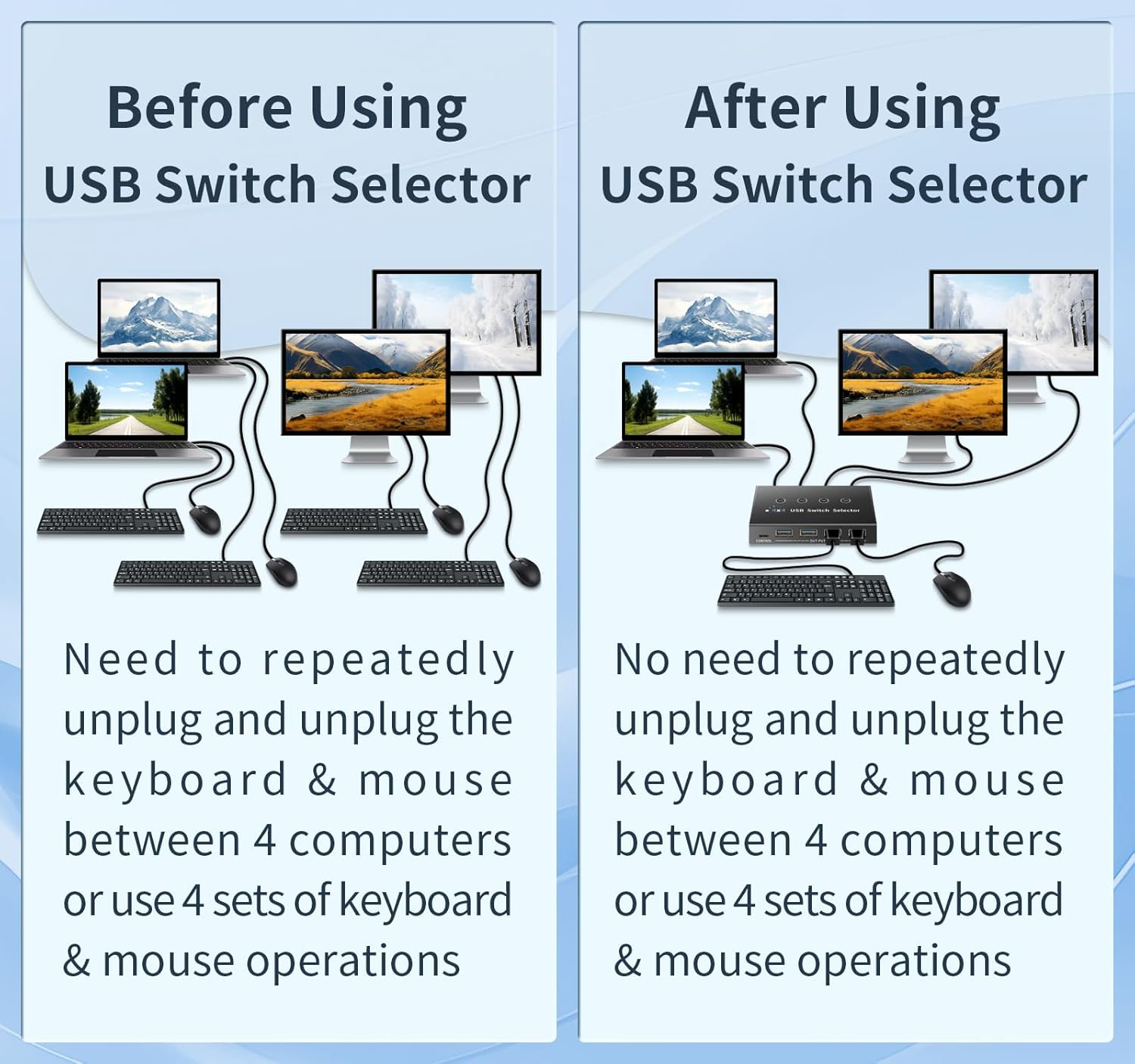 - 【USB Switch 4 Computer Sharing】the 4 port USB switcher supports one set of keyboard and mouse to control up to 4 computers, sharing 4 USB3.0 devices such as mouse keyboard, printer, removable hard disk and USB camera. One-click switching eliminates the need to constantly plug and unplug cables or set up complicated sharing software.