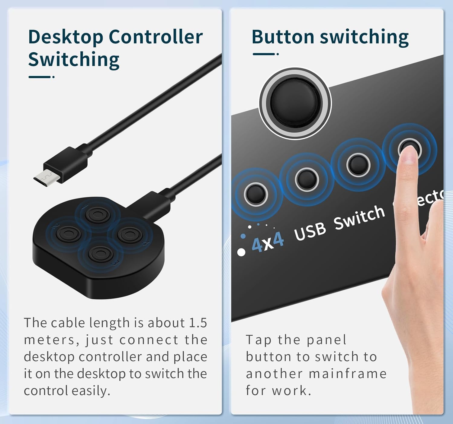- 【2 Switching Methods】the 4 port usb switch has 2 switching methods: push button switching and desktop controller switching, switching 4 computers with one click. It is recommended to use the desktop controller to switch, you can store the switcher and cables farther away from the desktop, the desktop is more clean and tidy.