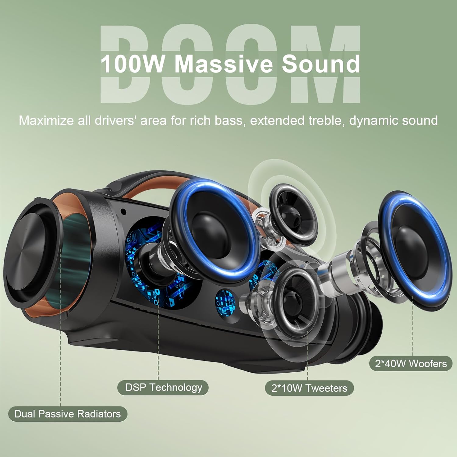 - 100W Powerful Sound: Dual 40W Woofers, dual 10W tweeters, two passive radiators, and two DSP technologies are designed to deliver a powerful full-range sound, thick bass, and clear treble with less distortion. Immerse yourself in a giant party with 100W of booming sound.
