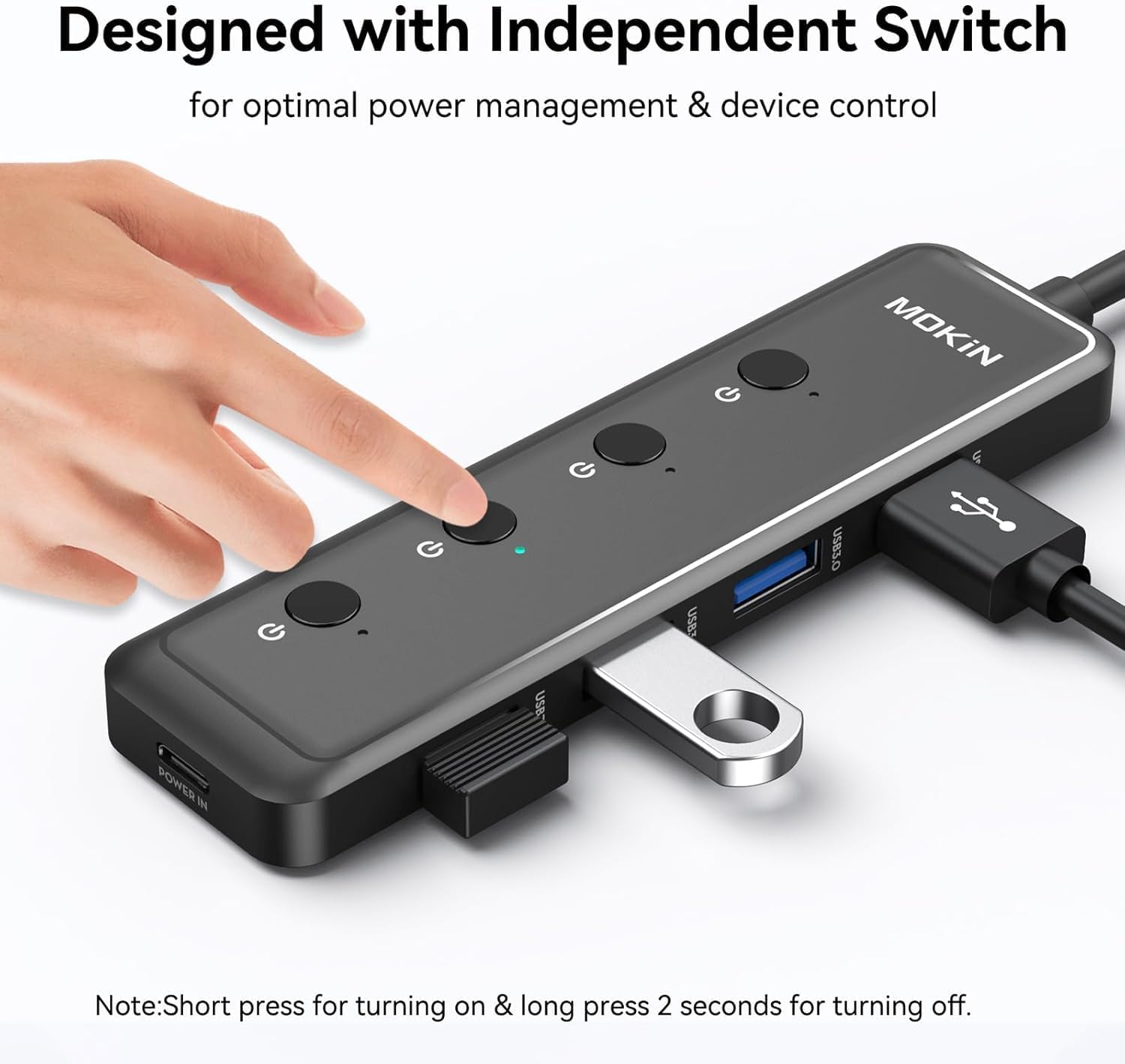 - Extend 4 USB 3.0 Ports: MOKiN USB Hub extends your device with 4 additional USB 3.0 ports, ideal for connecting USB peripherals such as flash drive, mouse, keyboard, printer. Note: This USB C port (with IN 5V printed) can not be used for data transfer and charge other devices; It can only supply power for the other 4 USB A ports, which can make data transfer more stable.