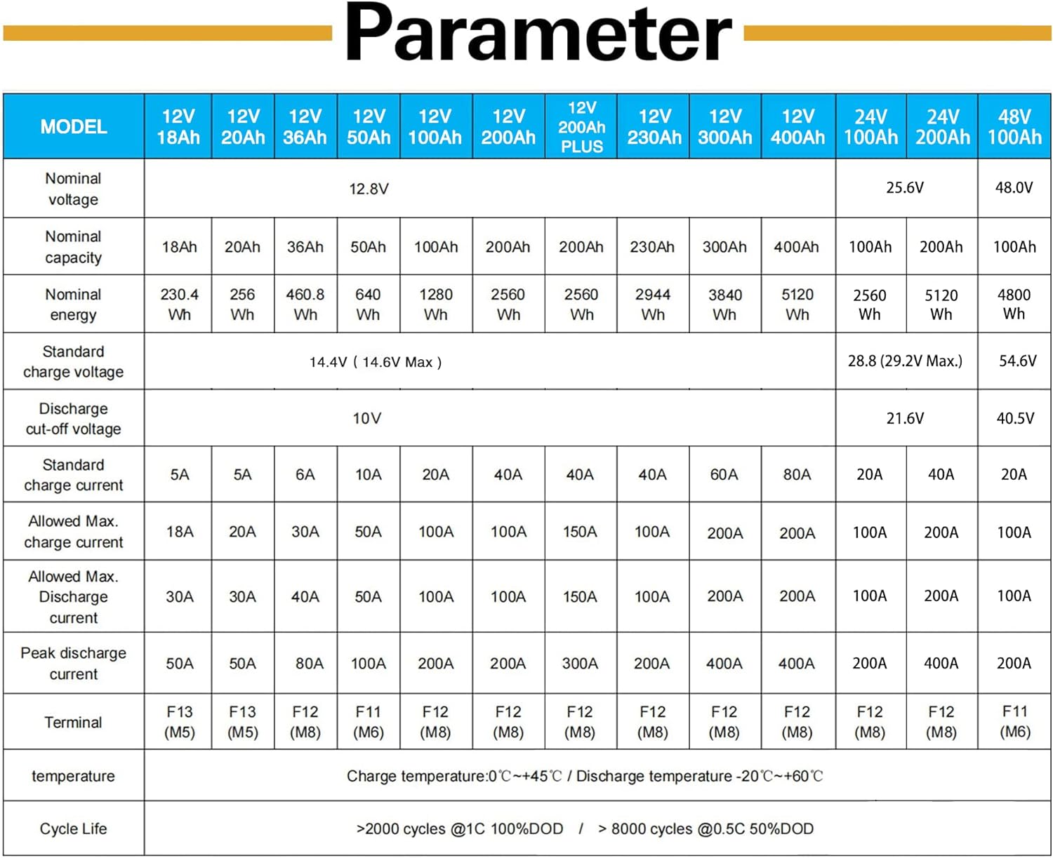 - ✅ BUILT TO LAST: Our 12V 100Ah LiFePO4 Batteries live more than 2000 cycles at 100%/8000 cycles at 50%(Suggested) depth of discharge, without decreasing in performance. The average lifetime of lead-acid batteries is about two years(500 cycles) at just 50% discharge. This basically means a LiFePO4 battery will last you at least 5 times longer than a lead-acid battery, which actually reduces overall cost. It has cold weather protection which is critical.