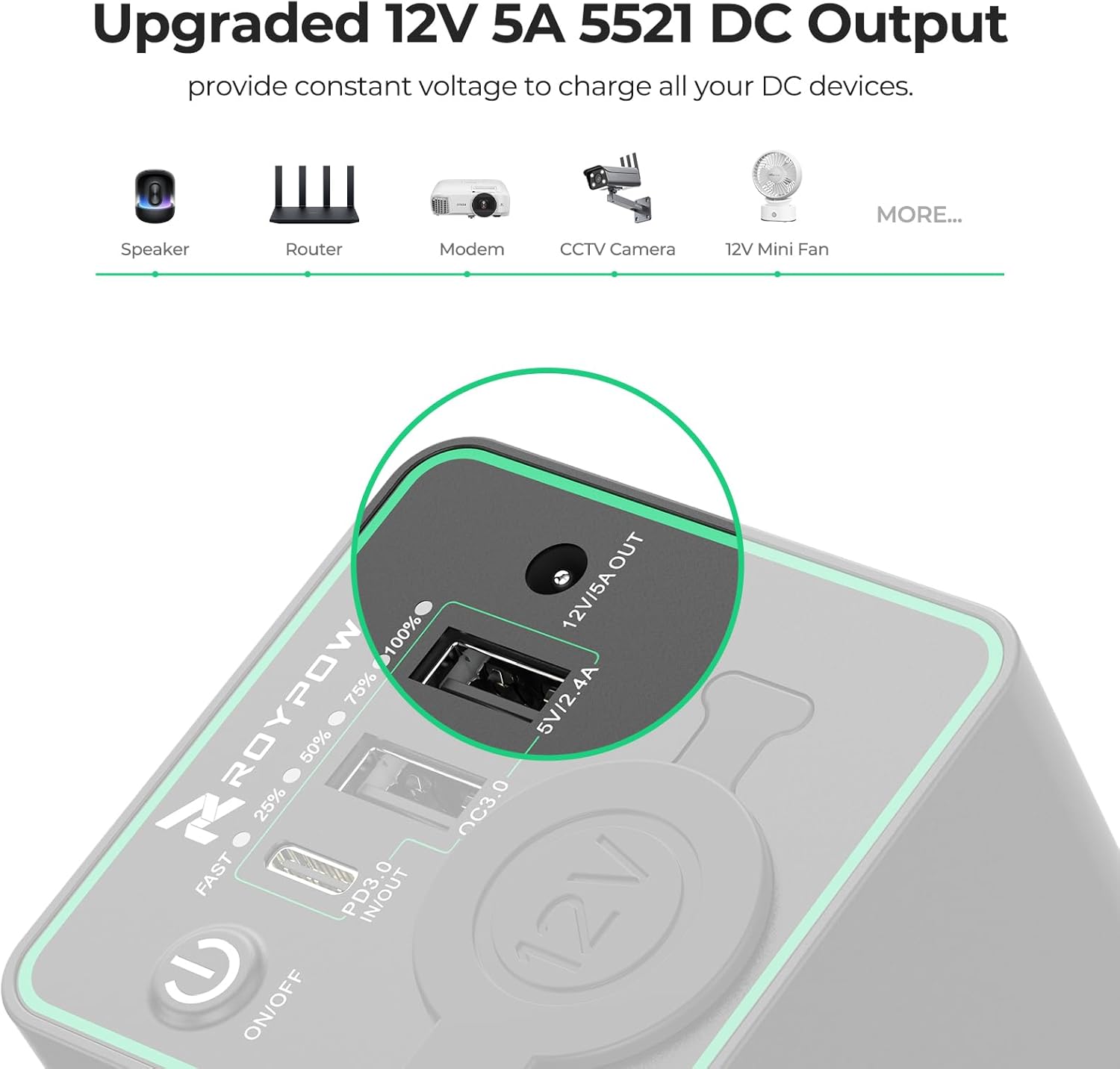 RoyPow 30W PD Portable Charger with 12V 10A Constant Voltage Cigarette Lighter Socket, 86.58Wh USB C Laptop Power Bank, 18W QC & 12V DC Battery Pack, Perfect for Dash Cam Astrophotography or Camping