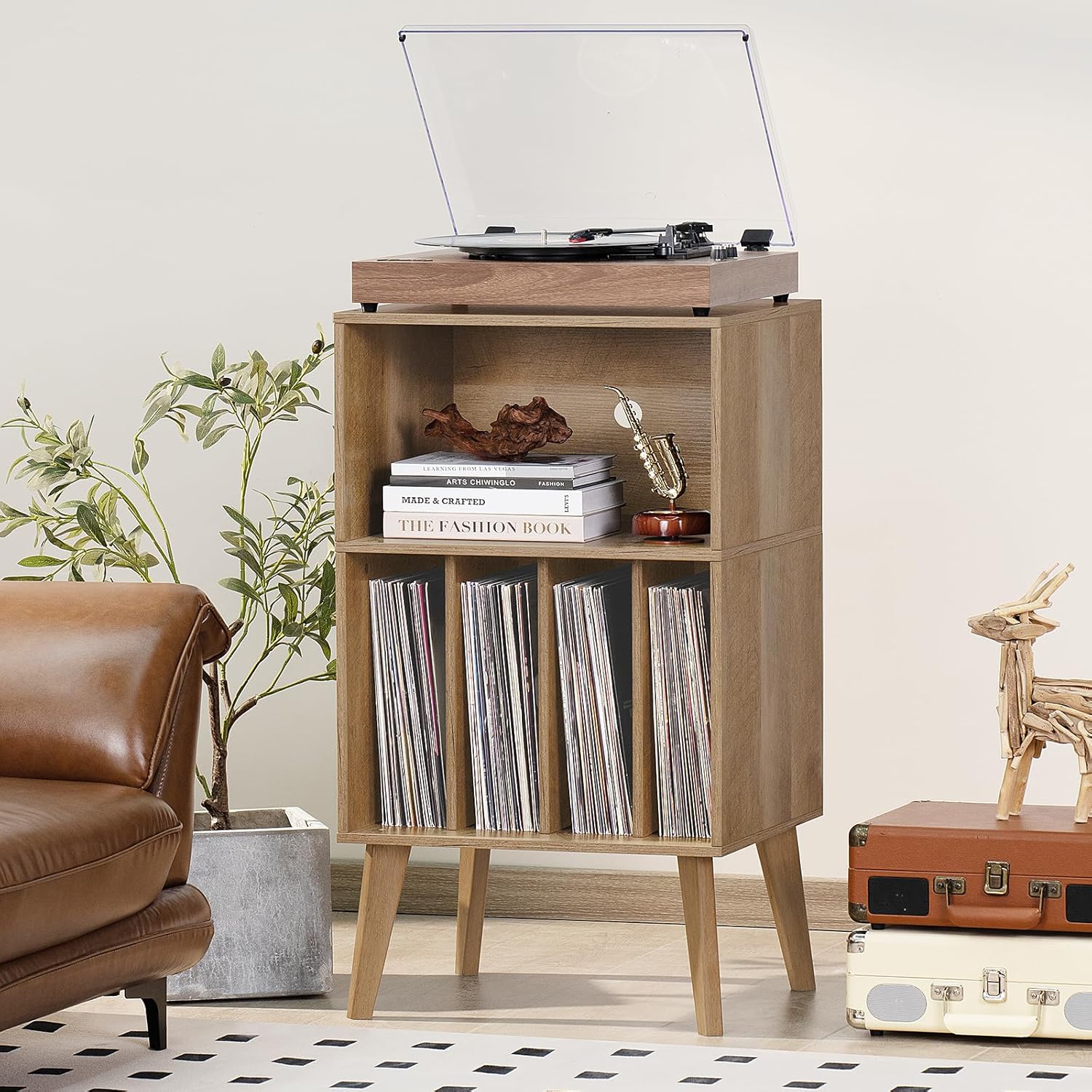 - 【Sturdy Angled Solid Wood Legs】We choose high-quality solid wood materials to make the slanted table legs.The solid wood table legs make the structure of the record player storage more sturdy, while creating a superior texture.The inside of the bold slanting table legs is reinforced with special screws.The sturdy support structure of the record cabinet makes it fearless of the test of time, and it precipitates a unique and calm atmosphere as time passes by.