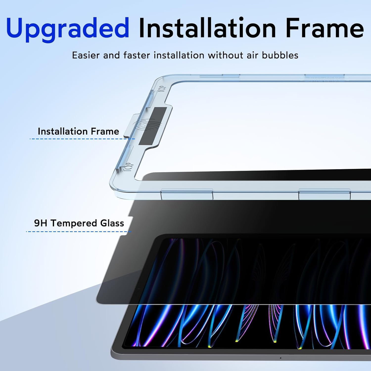 - Easy Application: With innovative installation frame, perfect iPad 12.9 inch screen protector applying is a breeze. Installation steps are convenient and quick, it is easy to achieve no bubbles, so that you have no trouble in the installation process