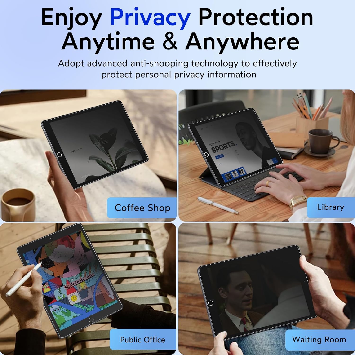- Horizontal 28° Anti-peep: Using advanced anti-snooping technology of iPad 9th generation screen protector can provide horizontal 28° super privacy barrier, prevent nearby people from peeping at your information, and more effectively protect personal privacy and sensitive information. Give you more peace of mind when using your iPad in public. By using the screen protector, you can provide left and right protection from prying eyes