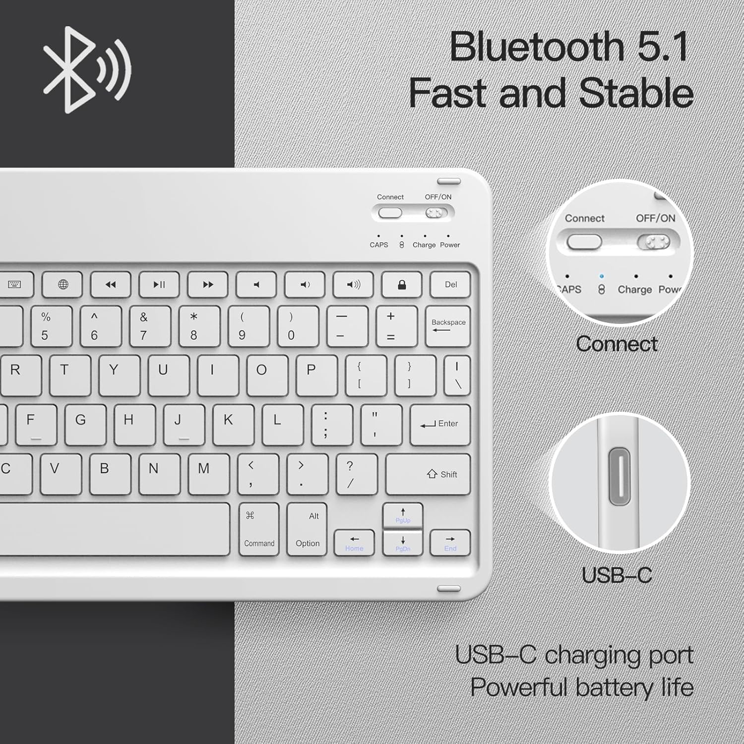 - [Rechargeable & Long Life Battery] After 2-3 hour full charge, the wireless keyboard provides 90 hours of continuous operation and stands by for up to 150 days. Besides, an included USB C cable makes it convenient to recharge the keyboard