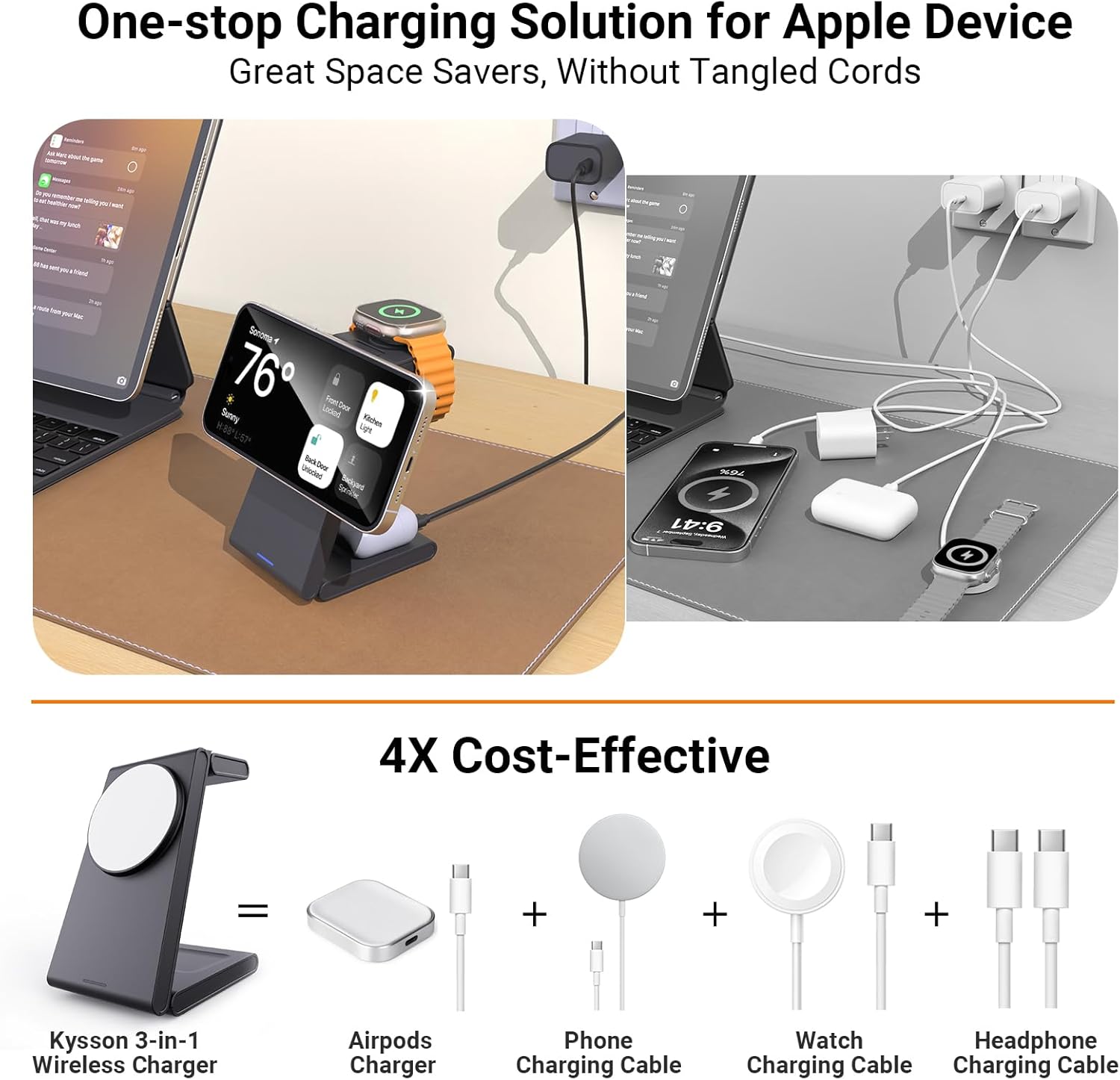 - 💕【Inclueded 20W adapter, Excellent Warranty&Customer Service】①Kysson magnetic 3 in 1 wireless charging station with MagSafe ②20W adapter(UL) ③3.3ft / 1m type c cable④a set magnetic ring⑤12-month ⑥lifetime customer service. Elevate your charging experience with Kysson iPhone charging station-it's more than just a wireless charger stand, it's a commitment to quality and service! If you have any questions, please let us know any time and we will reply within 12 hours