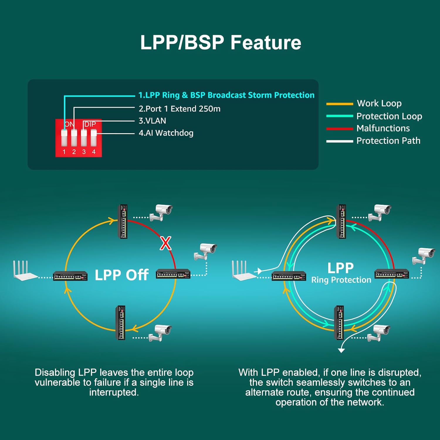 - 🌟AI Watchdog Mode - This enhanced 10-Port 1000Mbps ethernet PoE switch features AI Watchdog Mode. This advanced functionality automatically detects and rectifies port issues, guaranteeing uninterrupted power delivery to all connected devices. Elevate your network's security and reliability with seamless operation, ensuring unparalleled performance for your infrastructure.