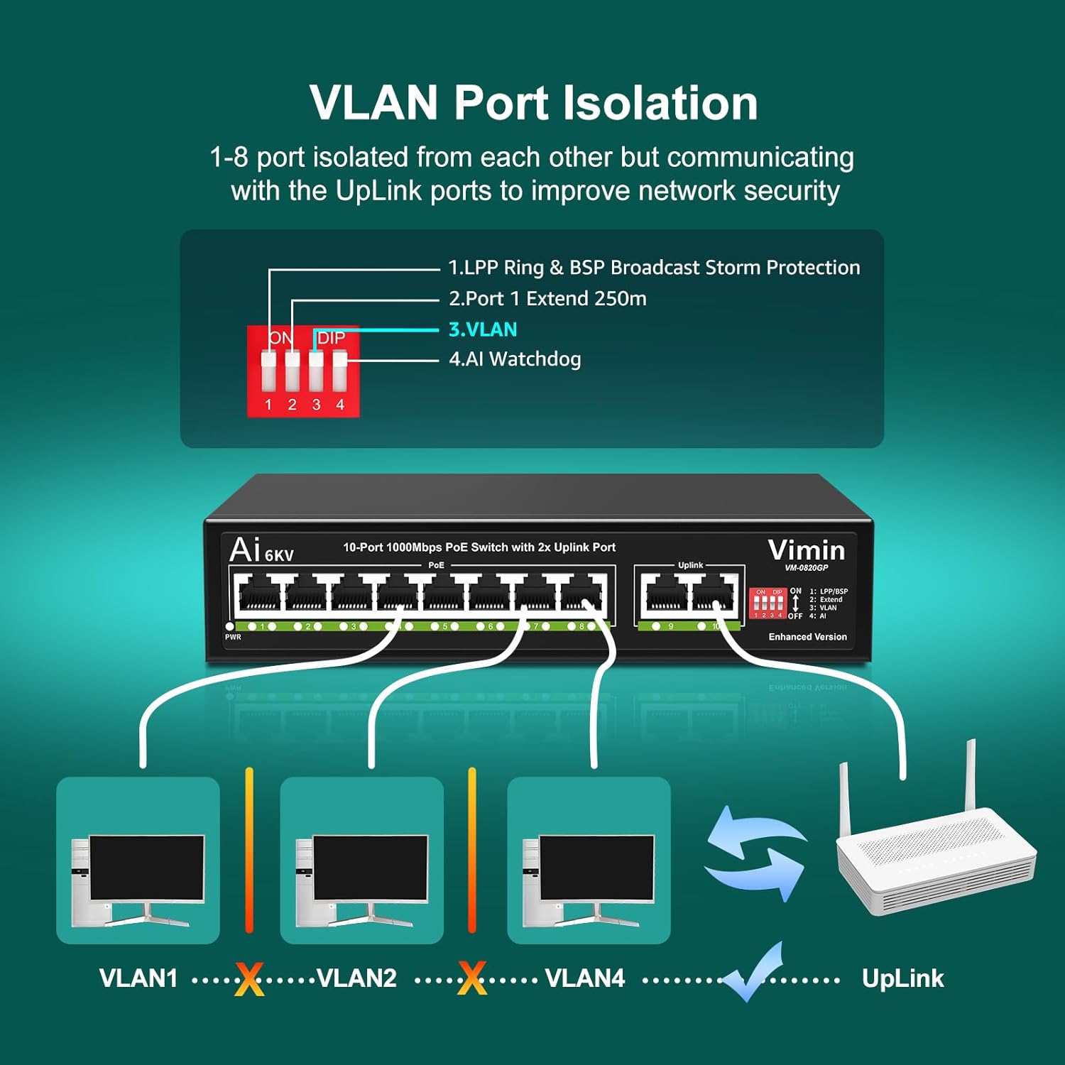- 🌟One-Key VLAN & Extend 250m - Our 10-port PoE network switch features an advanced One-Key VLAN mode. By isolating the 1-8 ports from each other while maintaining communication with the uplink ports, this mode improves network security and optimizes bandwidth utilization. Additionally, this switch with an extended distance of up to 250m. supports transmission speeds in 10Mbps.