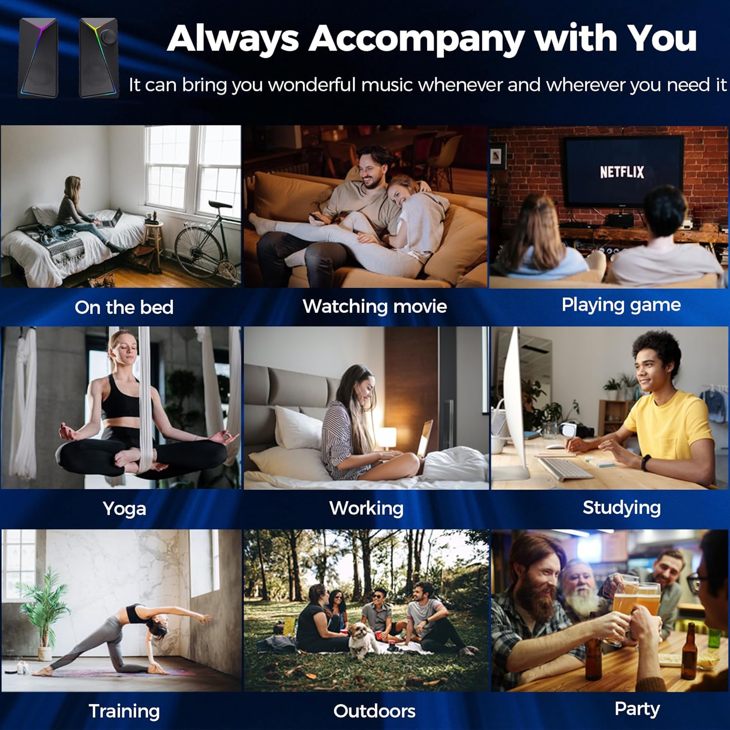 - Colorful RGB lighting - Not only the sound quality is solid, but also the lighting bar is attractive. Cool 7 dynamic light effects(Note: not adjustable), are designed for pc speakers for desktop, to personalize your desktop and enhance your gaming experience.