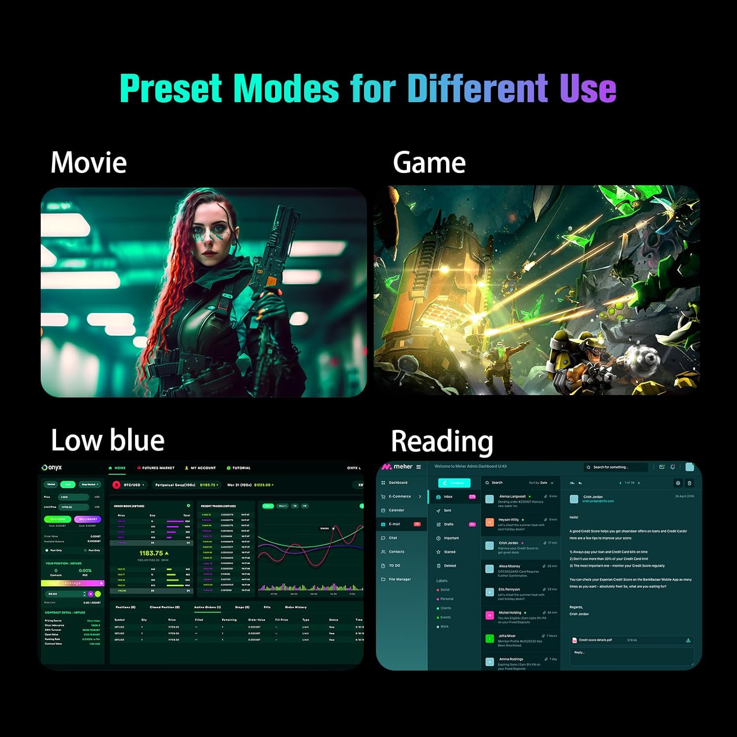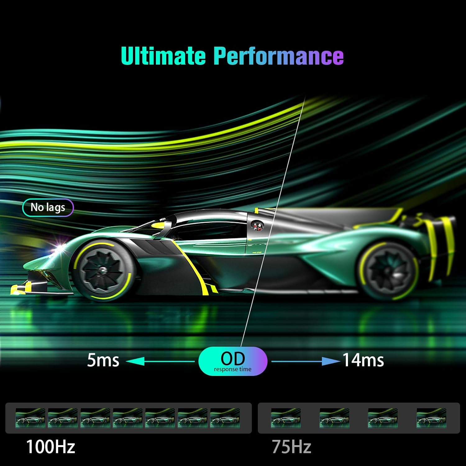 - Display: 100Hz Refresh Rate; MPRT 1ms Response Time; Adaptivesync; 110%sRGB color gamut; 4000:1 Contrast Ratio; 300Nits brightness; HDR, over drive, anti-flicker, anti-glare
