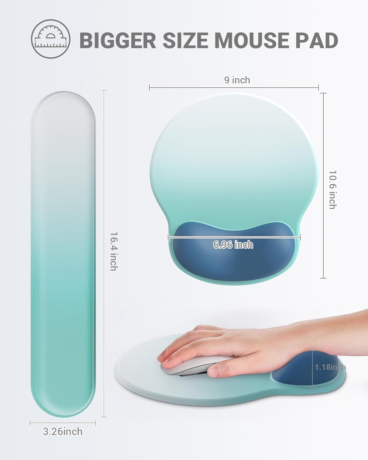 - 【Ergonomic Shape and Size】This 2-in-1 wrist rest set is designed for convenience, with a 16.4 x 3.26 inches keyboard wrist rest pad and a 10.6 x 9 inches mouse pad with a 1.18 inch thick wrist rest. You can move the mouse around more easily and freely. Good for working, gaming, or as gifts to your friends or family. (Note: Please make sure the desk has enough space for mouse pad set.)