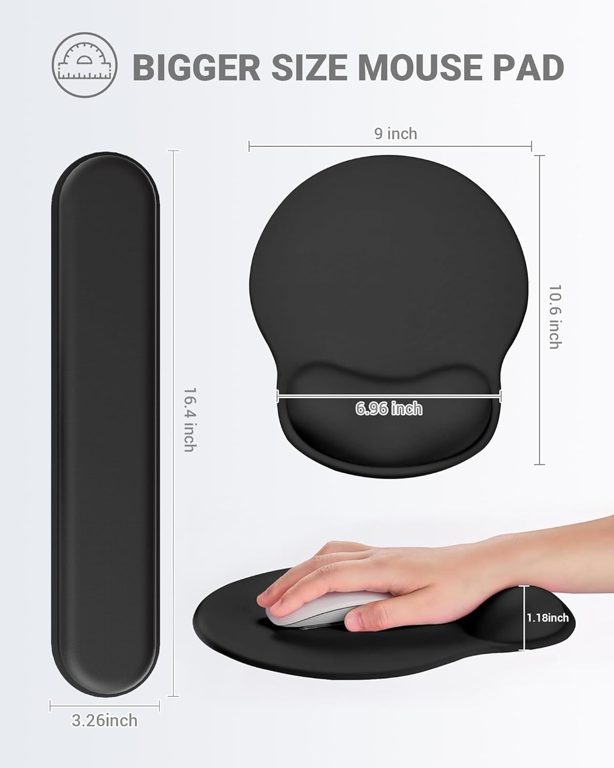- 【Ergonomic Shape and Size】This 2-in-1 wrist rest set is designed for convenience, with a 16.4 x 3.26 inches keyboard wrist rest pad and a 10.6 x 9 inches mouse pad with a 1.18 inch thick wrist rest. You can move the mouse around more easily and freely. Good for working, gaming, or as gifts to your friends or family. (Note: Please make sure the desk has enough space for mouse pad set.)