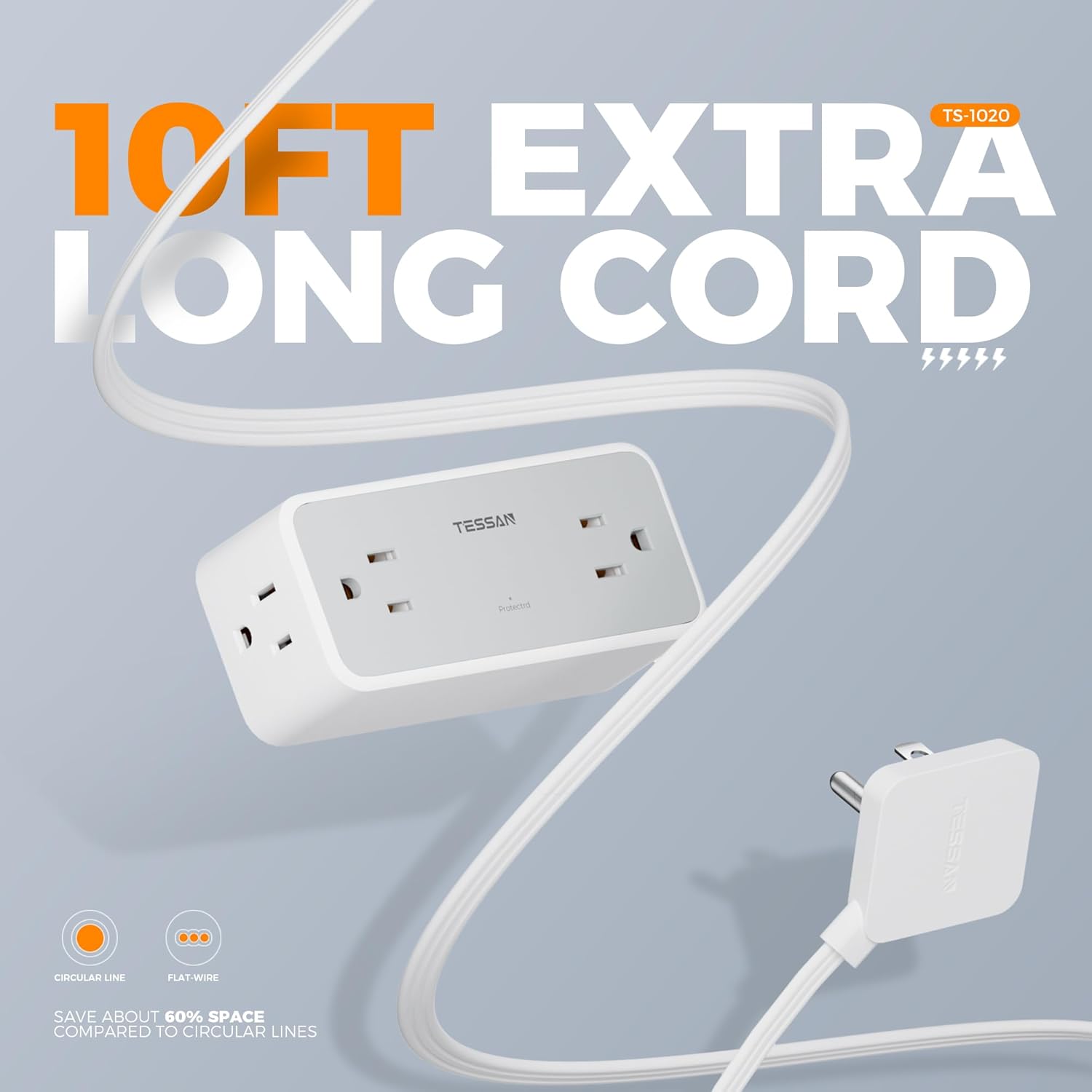 - 10Ft Extension Cord: Extra long 10ft cord is more flexible to reach distant outlets and hard-to reach-places; 0.12in flat cord can easily run along the wall, floor or under carpet without causing a bulge, protect your family from tripping, makes sweeping and mopping easier
